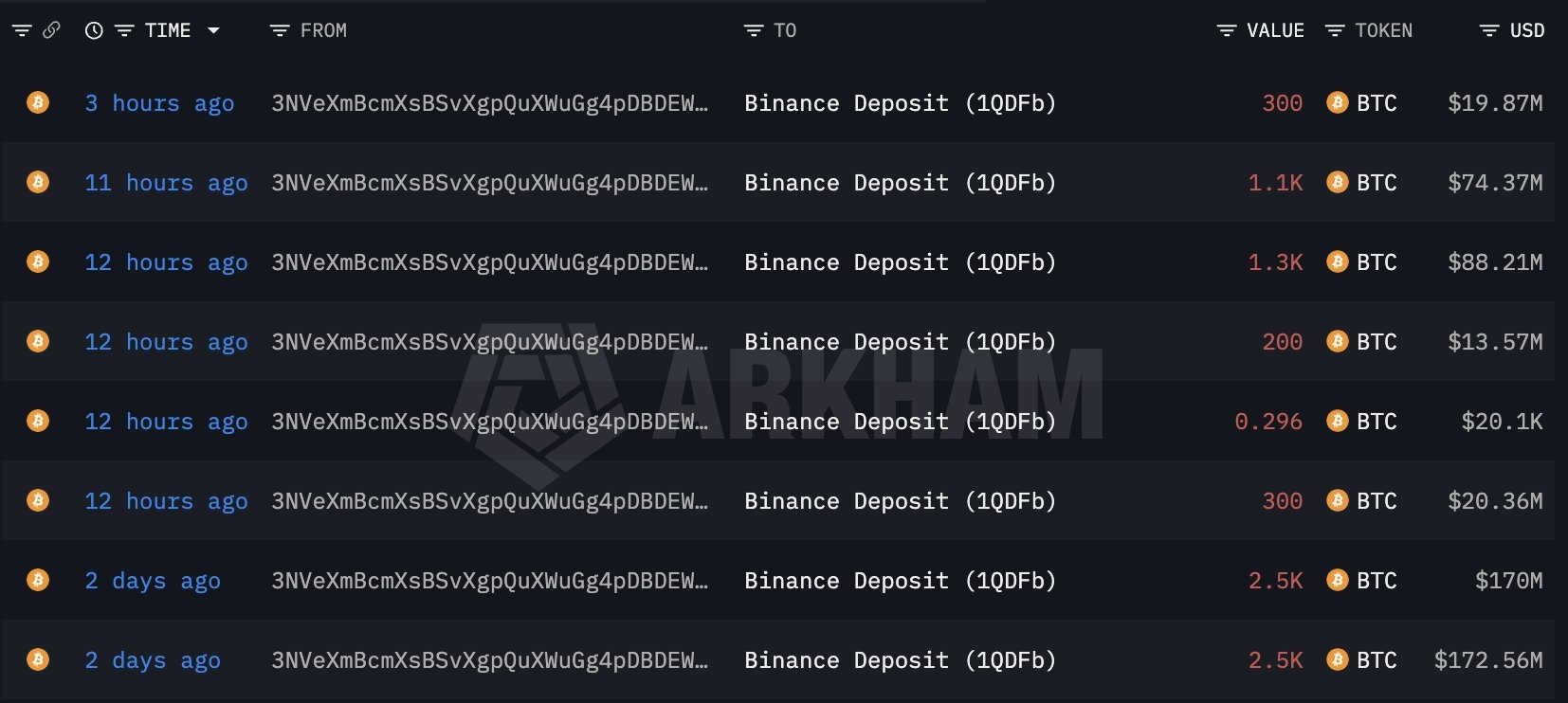 Over the past couple of days, we witnessed a striking example with a single whale (wallet starting with 3NVeXm) depositing a total of around 8,200 BTC — roughly equivalent to $559 million — into Binance.What stands out is the clear pattern: almost every time this whale makes a significant deposit, Bitcoin’s price drops shortly afterward. Two days ago, 2,500 BTC (≈ $170–172 million) was transferred to the exchange, followed by noticeable downward pressure