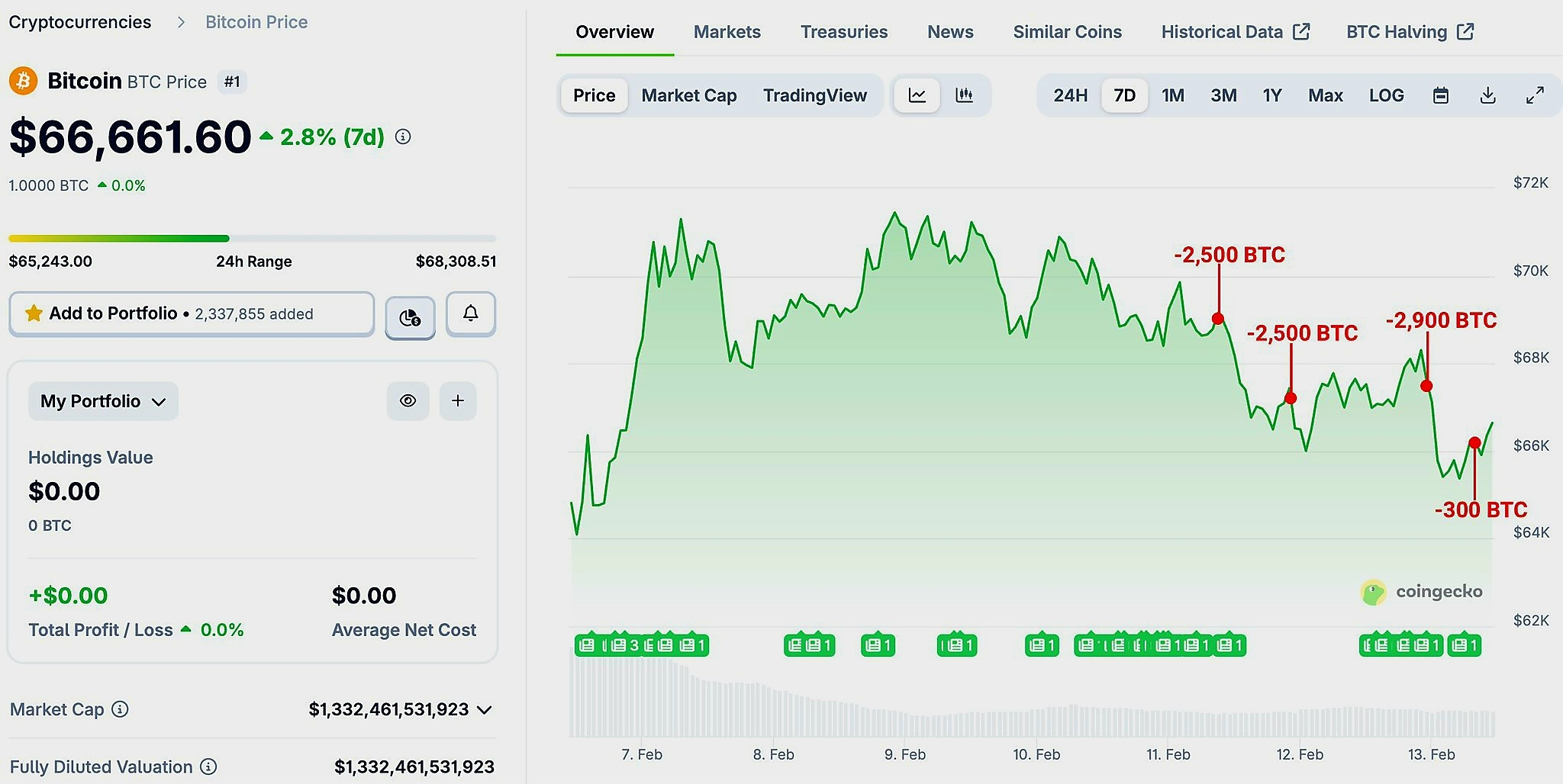 In each case, the market reacted with either an immediate or delayed sell-off.Right now, Bitcoin is trading around $66,661 (showing a modest +2.8% over the past 7 days), yet it remains well below the recent peaks near $70–72K. The chart clearly marks these pressure points: red annotations highlight drops following the -2,500 BTC, -2,900 BTC, and -300 BTC deposits