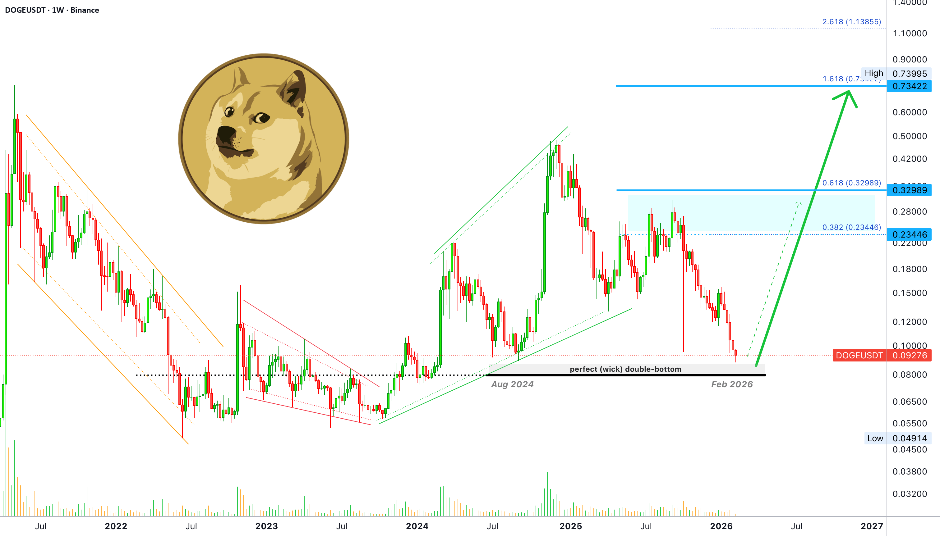 في فبراير 2026، أنتج الدوجكوين قاع مزدوج مثالي مع أغسطس 2024. كانت منطقة الدعم نفسها، هنا موضحة بخط أسود عريض، قد تم تحديها فقط مع فتيل الشمعة.