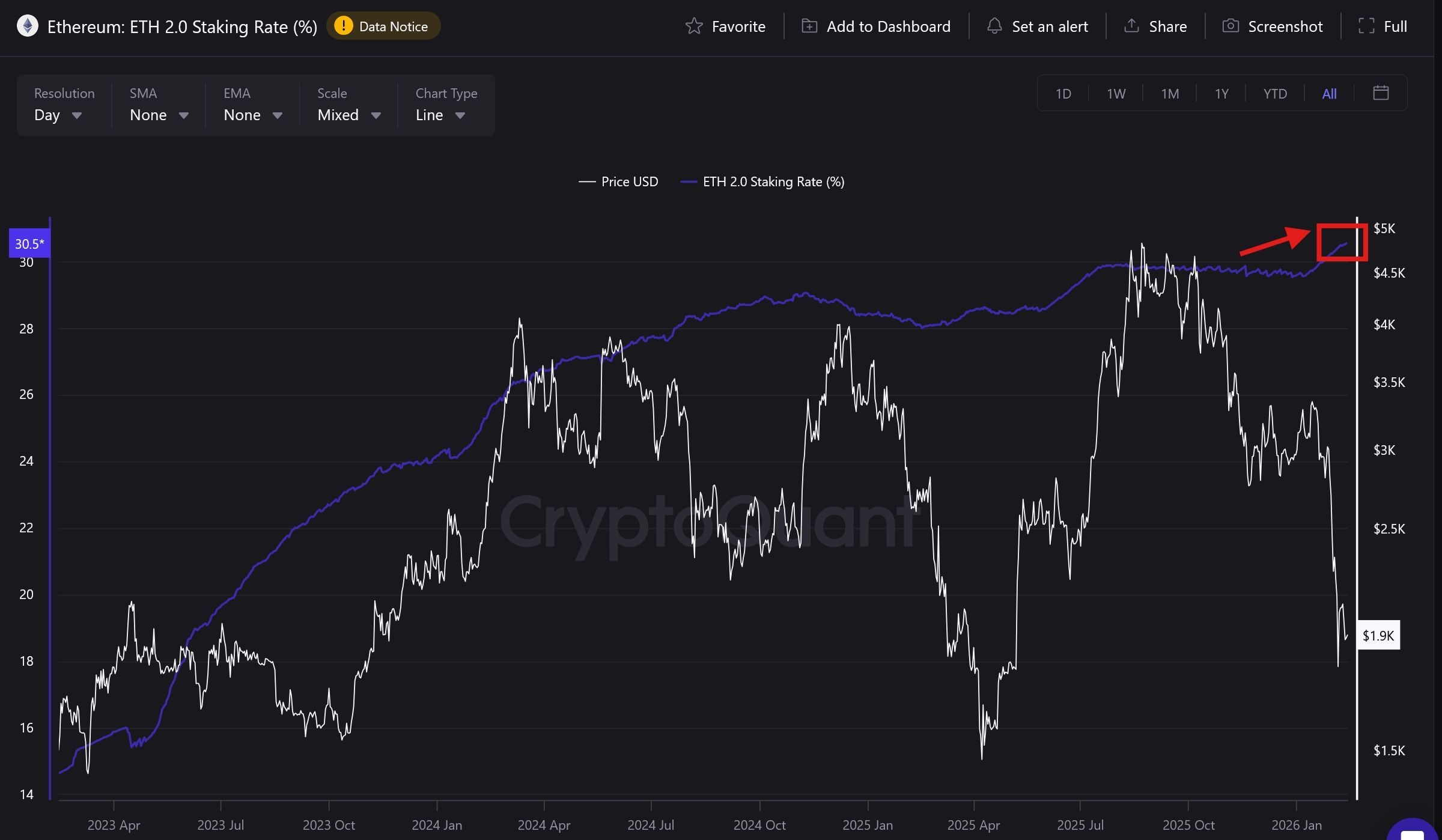 Điều khiến thời điểm này trở nên đáng chú ý là sự phân kỳ giữa giá và tỷ lệ staking hiếm khi kéo dài lâu.
