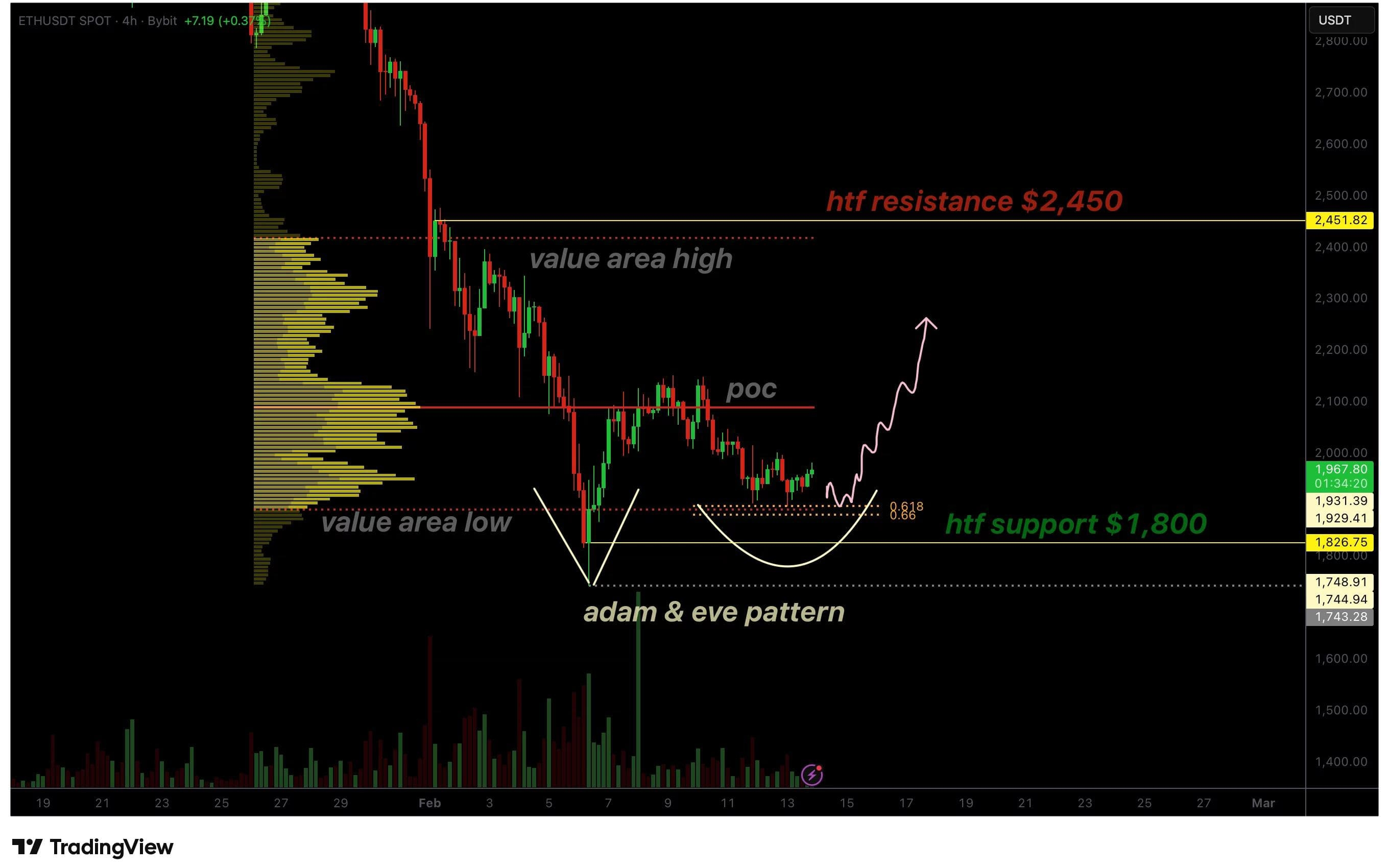 For the Adam and Eve pattern to be activated, Ethereum must reclaim the point of control on a closing basis. The point of control represents the price level with the highest traded volume and often acts as a pivot between bearish and bullish regimes.