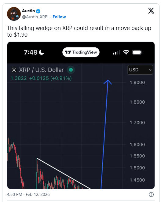 $XRP Crypto analyst Austin (@Austin_XRPL) recently highlighted a technical setup on XRP that could signal a significant upward move. The chart shows XRP trading at $1.3822, positioned within a narrowing price pattern that has drawn attention from traders. According to Austin, this pattern could push XRP back toward $1.9 if the breakout confirms.