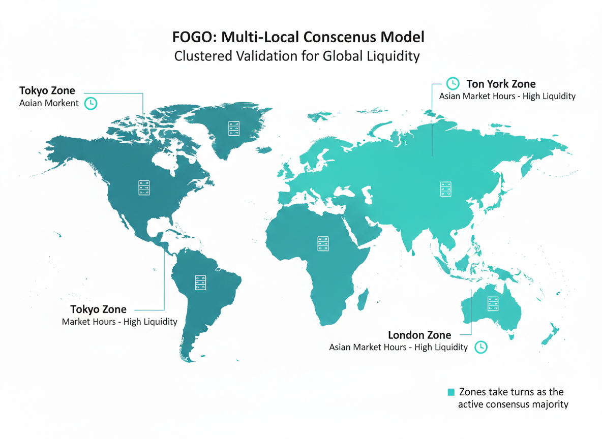 Fogo's multi-local consensus model is the most interesting thing in their whitepaper, and almost nobody is talking about it. The idea is simple in retrospect. Instead of pretending geography does not matter, embrace it. Cluster validators in the places where trading actually happens. Tokyo for Asia hours. London for Europe. New York for the United States. Let the region that is awake handle consensus while the others sleep.