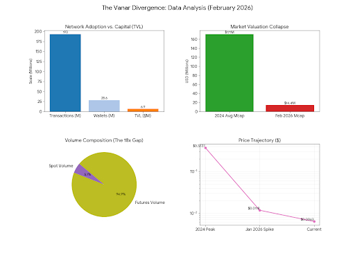 The token price is terrible. I have to say that because anyone looking at $VANRY right now sees a chart that looks like a staircase going down. This is either a buying opportunity or a value trap and I cannot tell you which with confidence. What I can tell you is that the network usage continues even as the price bleeds, which is the opposite of what usually happens. Usually price goes down, usage goes down faster. Here usage holds.