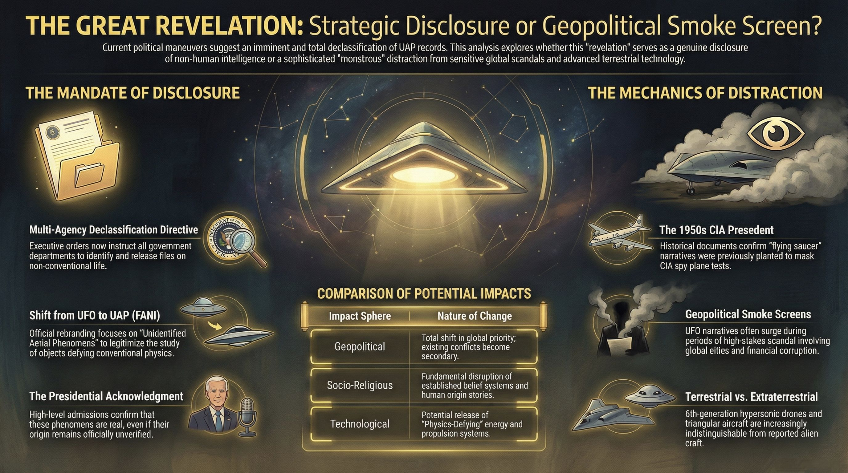 El mecanismo de control de la CIA consistía en engañar al público sobre la naturaleza de los avistamientos para ocultar las pruebas de aviones espía (como el U-2). La lección histórica es clara: el Estado no desclasifica información para iluminar al ciudadano, sino para gestionar el miedo. Al clasificar algo como "secreto" y luego liberarlo selectivamente, el gobierno genera una sensación de "generosidad informativa" que oculta el hecho de que sigue controlando el acceso a la realidad. Esta táctica paraliza el juicio crítico; cuando el ciudadano se arrodilla ante la posibilidad de una "revelación superior", deja de cuestionar la opacidad de los despachos donde se decide el destino económico y militar del mundo.
