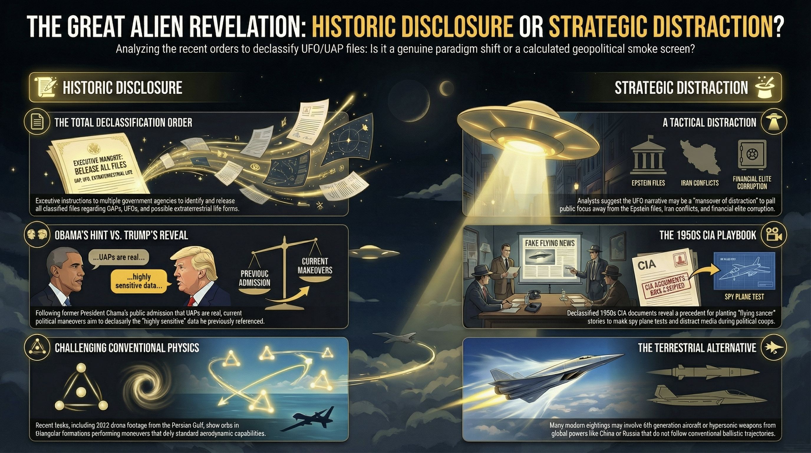 El actual juego de tensiones entre figuras políticas —donde se critica la "imprudencia" de unos al hablar de extraterrestres en podcasts mientras otros presumen de su "generosidad" al desclasificar archivos— demuestra que el tema UAP es una pieza de ajedrez en la lucha por el poder interno. Tanto Donald Trump como Barack Obama, a pesar de sus aparentes diferencias, operan dentro del mismo marco de gestión narrativa: utilizar el misterio institucionalizado para mantener la relevancia del Estado como único árbitro de la realidad.