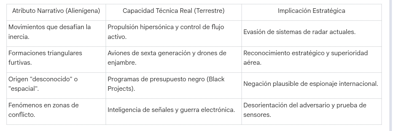 El uso de la narrativa "extraplanetaria" es una herramienta de doble uso. Primero, permite a las potencias probar prototipos en espacios aéreos extranjeros sin admitir violaciones de soberanía o revelar capacidades técnicas a sus adversarios. Segundo, justifica presupuestos de defensa astronómicos. Un ejemplo es la propuesta de la "Cúpula Dorada", un sistema de defensa nacional masivo destinado a proteger el territorio estadounidense. Justificar un gasto de tal magnitud ante una población económicamente agotada es inviable si la amenaza es solo terrestre; sin embargo, si la amenaza "rompe las reglas de la física", la inversión se vuelve una cuestión de supervivencia existencial para la humanidad.