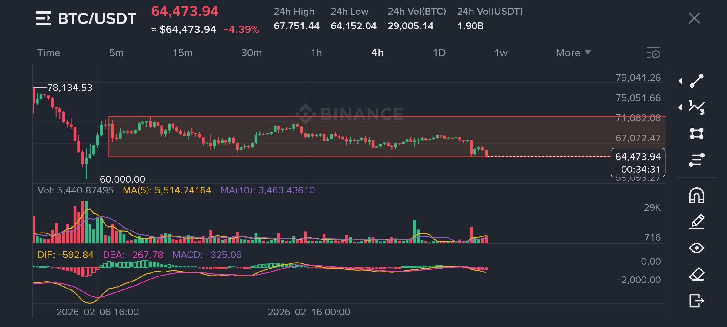 Bitcoin (BTC/USDT) is consolidating inside a clear resistance and support range on the 4-hour chart. Price is currently near the lower boundary around $64,000, showing bearish pressure. Volume and MACD indicate weakening momentum. A breakout or breakdown from this zone could define the next major move.