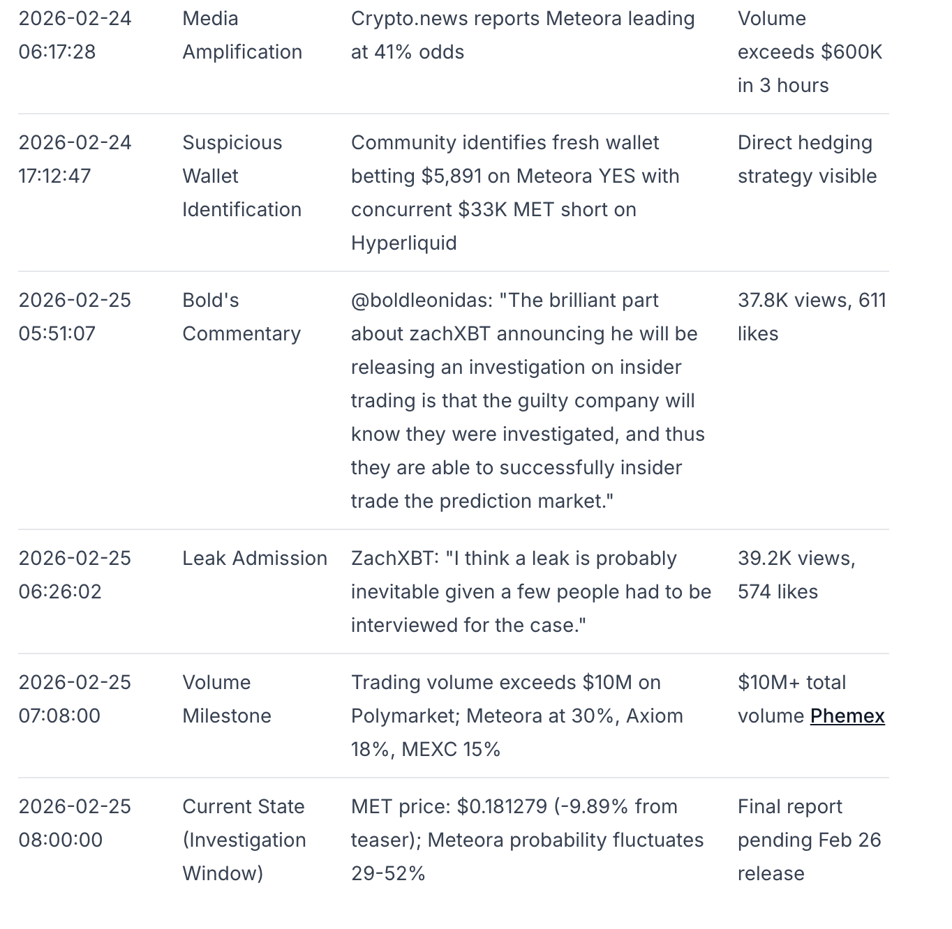 Blockchain investigator ZachXBT's announcement of an upcoming insider trading exposé triggered a reactive, socially-amplified selloff in high-revenue tokens, with Meteora's Polymarket probability surging from 10% to 52% and tokens like $MET