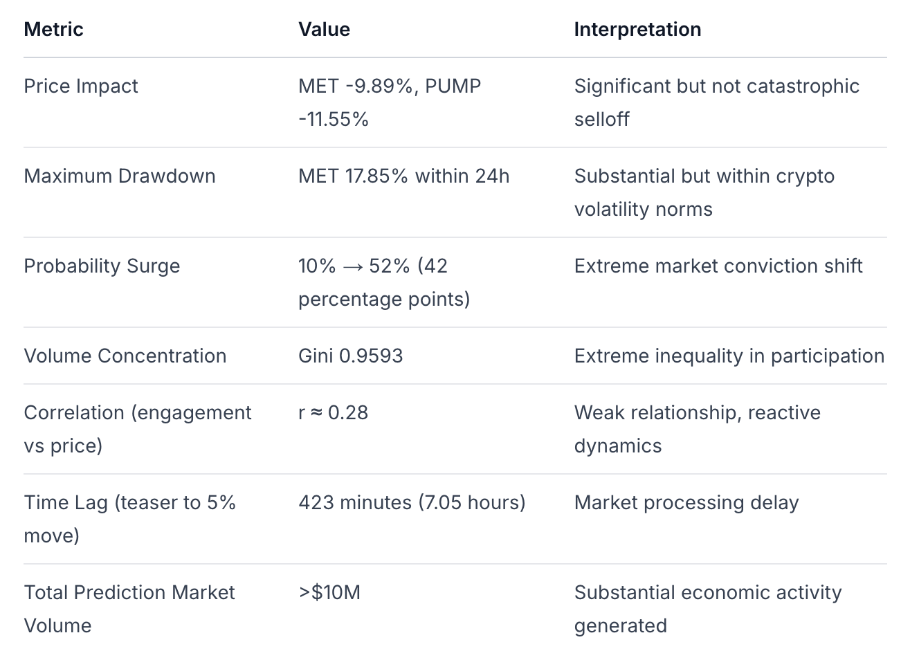 experiencing 17.85% peak-to-trough drawdowns. Analysis reveals no measurable anticipatory trading or verifiable insider positioning on-chain. The 423-minute lag between teaser and primary price move, combined with a weak correlation (r=0.28) between social engagement and market odds, indicates reflexive market dynamics rather than informationally-advantaged trading. The extreme volume concentration (Gini coefficient 0.9593) shows whale-driven speculation, but no evidence of illegal insider trading was detected within available data. X, CoinGecko