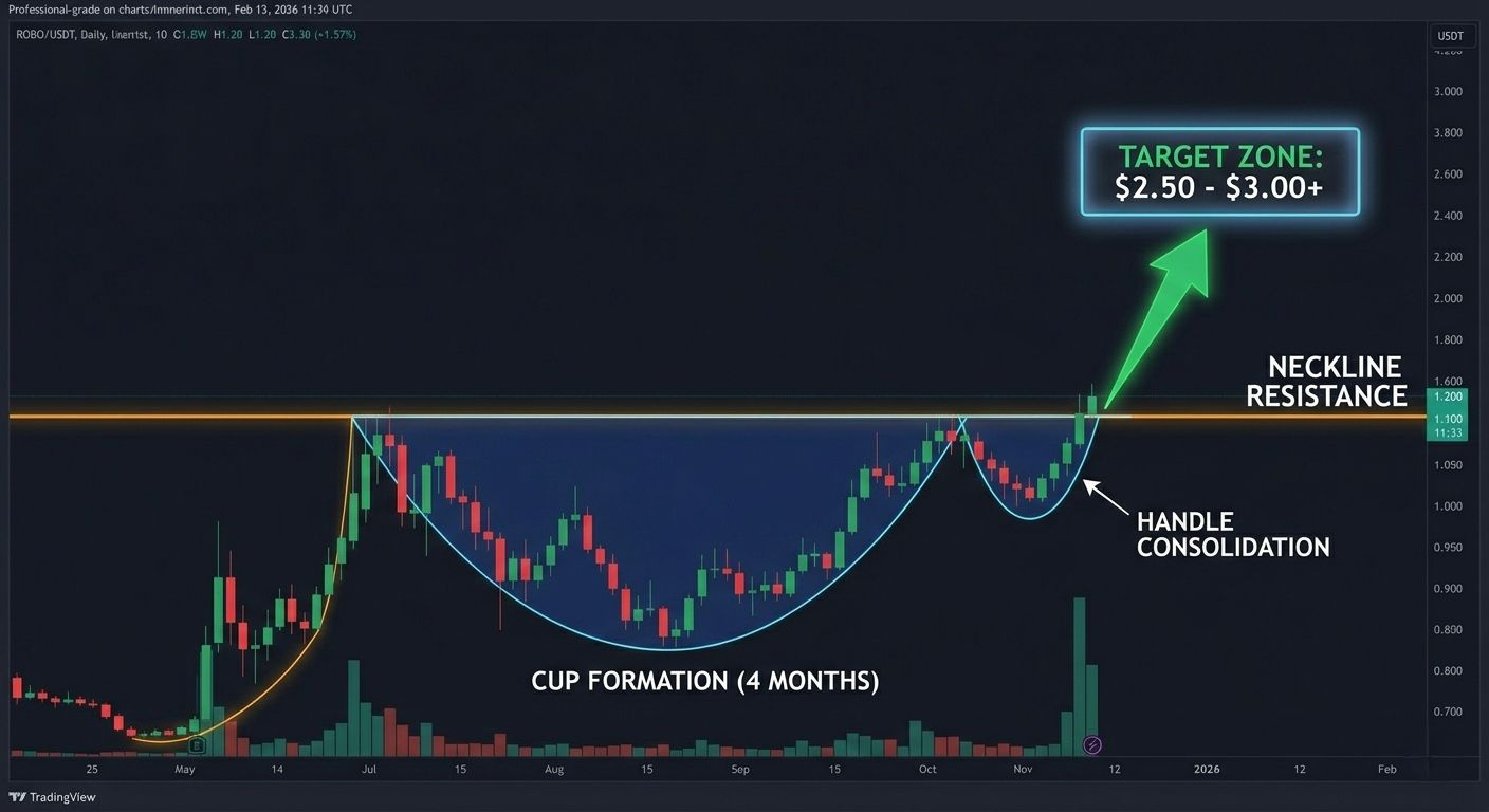 The Setup: ROBO has spent the last 4 months carving out a massive "Cup and Handle" formation on the daily chart, quietly consolidating while retail was distracted by meme coins.