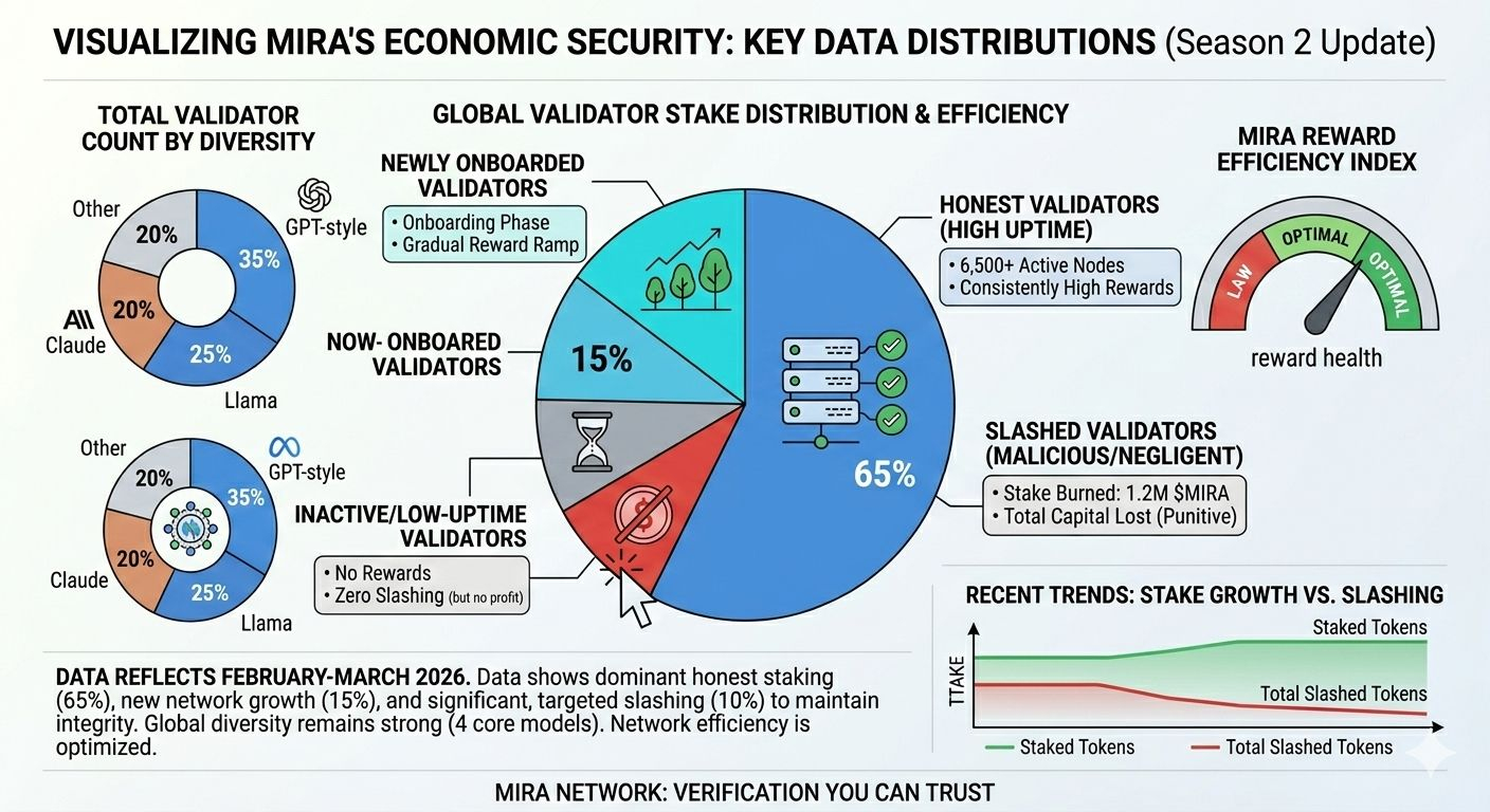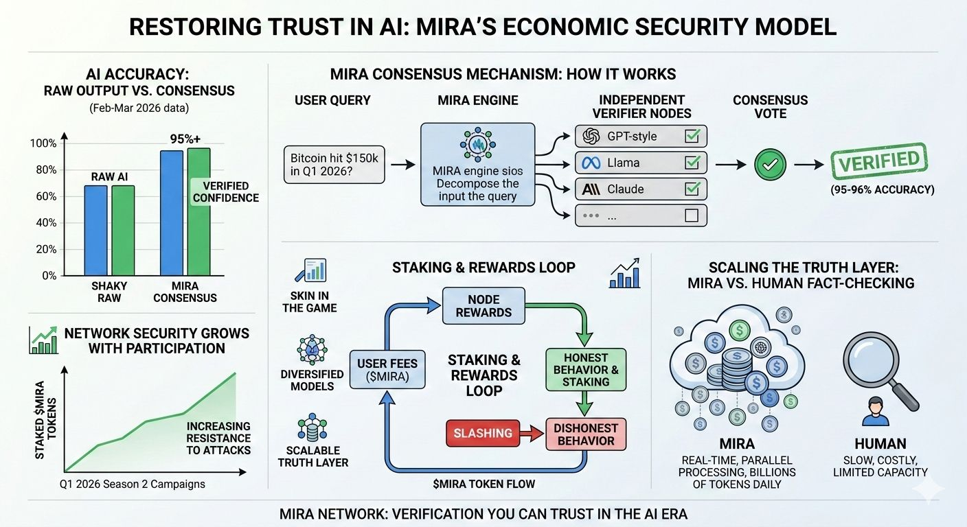 But the part that really gets me excited and a bit protective, if I’m honest is how they keep everyone playing fair with their economic security model. It’s not some idealistic “everyone’s honest” dream; it’s built on cold, hard incentives that mirror how people actually behave. Users pay a fee in Mira tokens to get stuff verified (kinda like tipping for reliability), and that money flows to the node operators doing the work. To join as a node, though, you have to stake MIRA put real skin in the game. If you’re lazy, guessing randomly, or trying to push biased junk, the network spots patterns (like too many deviations from the group or suspiciously lucky random hits), and slash your stake gets burned. Poof. Makes cheating way more expensive than just doing the job right.