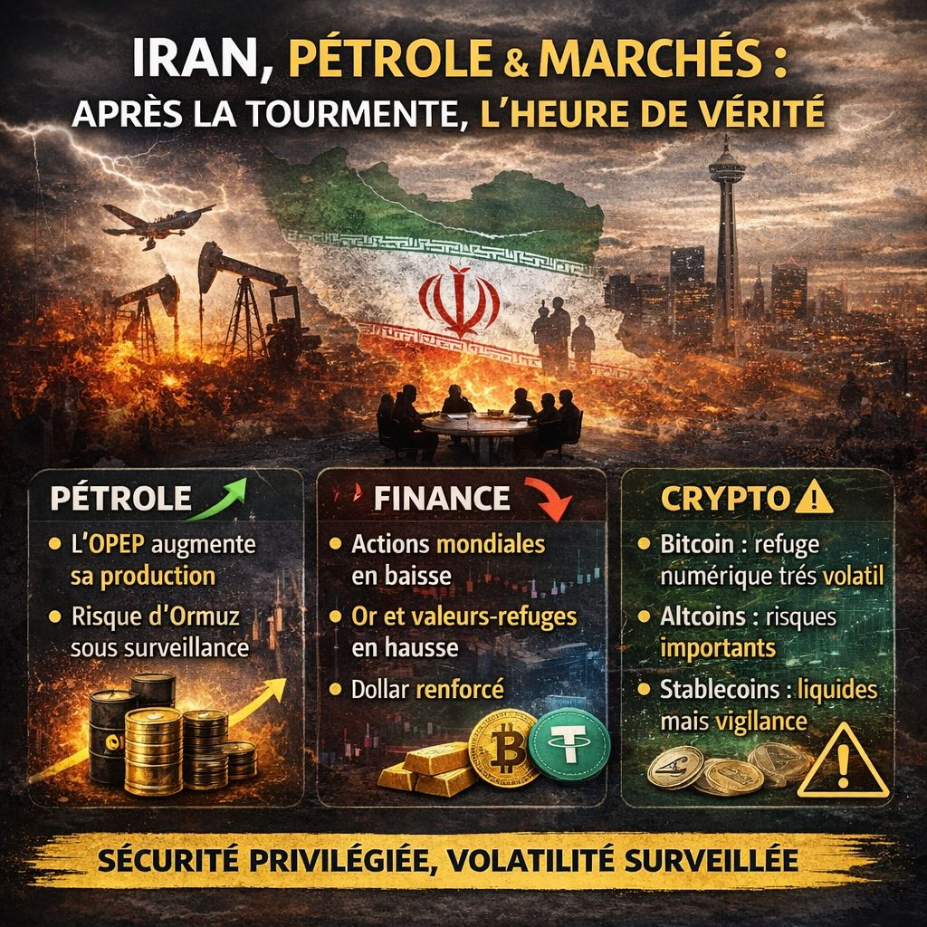 En conclusion, le choc provoqué par la crise iranienne ne se traduit pas uniquement par des perturbations politiques, mais par un ajustement global des marchés énergétiques, financiers et numériques. Qui se traduisent pour le Pétrole, la Finance et la Crypto respectivement par la hausse maîtrisée grâce à l’OPEP, mais avec une sensibilité géopolitique élevée, le retour aux valeurs refuges et le Bitcoin comme valeur refuge numérique, les Altcoins sous pression, les Stablecoins comme outil de gestion de liquidité.