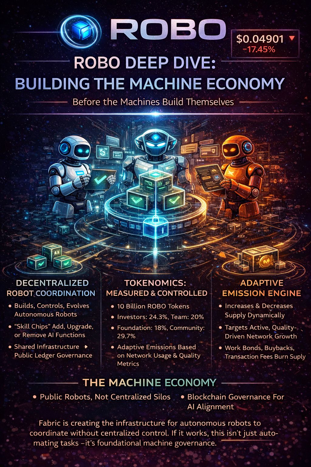 ROBOUSDT is trading around 0.04901, down 17.45%. The market is clearly volatile. But price movement and long-term infrastructure are two very different conversations. When we step away from the red candles and look at the December 2025 whitepaper, Fabric Protocol presents something much larger than short-term trading action. It proposes a decentralized coordination layer for robots and AI systems with ROBO at the center of that machine economy.