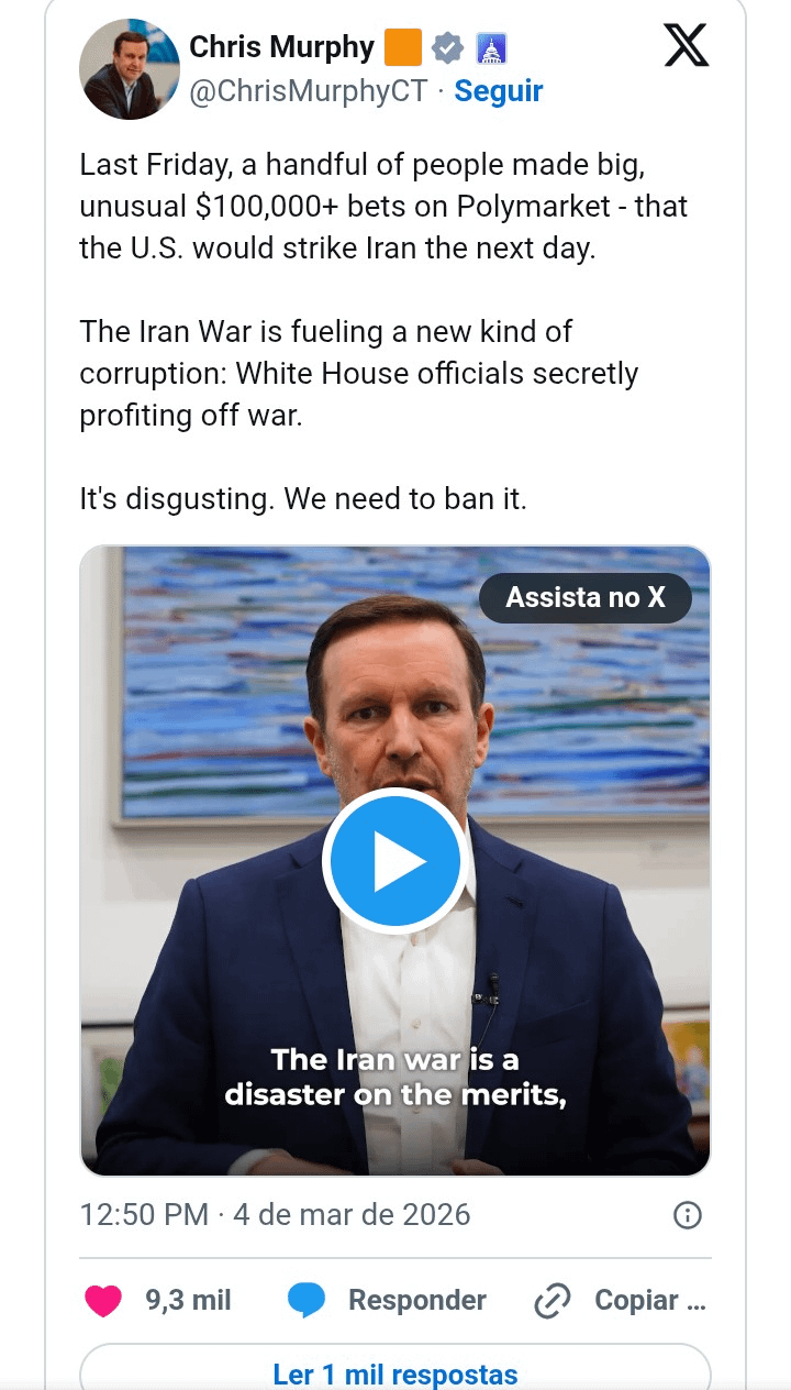 Mas esse trem tá dando confusão. O Senado dos EUA até rejeitou uma resolução que queria limitar o poder do presidente Donald Trump de continuar ação militar sem passar pelo Congresso. O senador Murphy já falou que vai tentar proibir esses mercados de previsão, porque segundo ele, tem gente usando informação privilegiada pra ganhar dinheiro em cima de decisão de governo.
