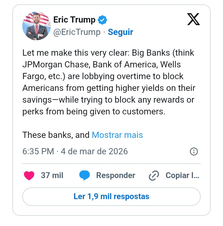 Eric Trump, o fio do presidente dos Estados Unidos e mexedor com essas coisa de cripto, resolveu dá pitaco na conversa que tá pegando fogo: de um lado o povo da blockchain, do outro os bancão tradicional. O que ele fala é que o consumidor lá nos EUA tá ficando pra trás, porque os bancos tão cuidando mais dos interesse deles do que do povo.