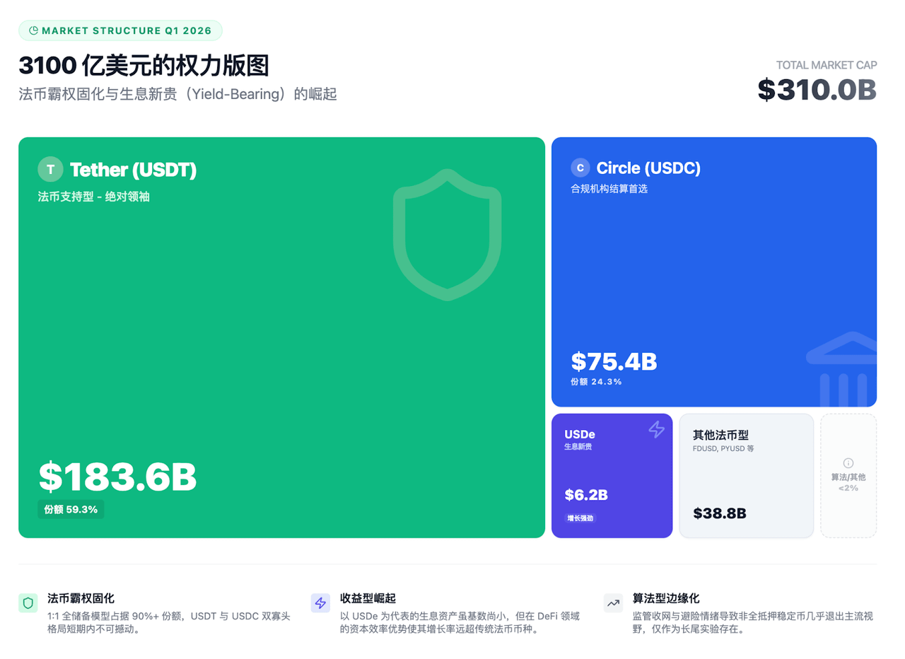 在合规与原生金融需求的两极驱动下,2026年第一季度的稳定币市场版图正在经历一场高度集中的结构性重塑 。