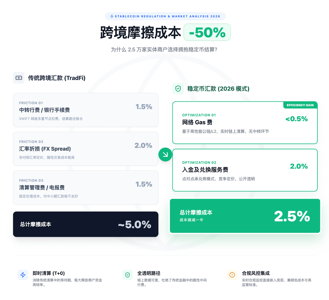 在跨境支付与传统金融(TradFi)融合方面,稳定币正在从根本上重塑商业汇款的成本结构。相较于传统银行通道动辄 5% 的跨境摩擦成本,基于稳定币的汇款通道已将平均费率压缩至约 2.5% 的水平。这种底层效率的跃升,直接推动了跨国企业结算与供应链金融的大规模采用。目前,全球已有超过 2.5 万家实体商户直接接受稳定币支付,而 B2B 的跨境稳定币支付年化规模也已突破 360 亿美元。与此同时,Visa、Mastercard、PayPal 以及 Stripe 等全球支付巨头已不再局限于早期的沙盒试点,而是将稳定币结算深度嵌入其底层支付轨道中,完成了与现有法定货币体系的无缝对接。