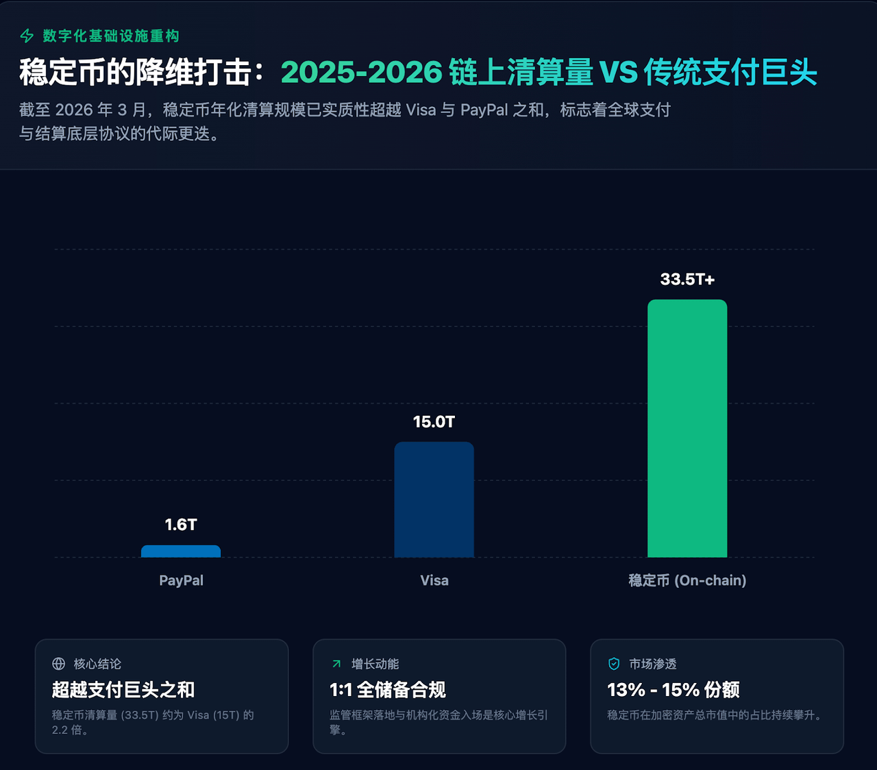 从链上活跃度与宏观清算数据的交叉对比来看,当前稳定币的年化名义清算规模已经客观超越了 Visa 与 PayPal 等传统支付巨头年处理量之和,成为全球范围内资金流转效率最高的数字化基础设施。