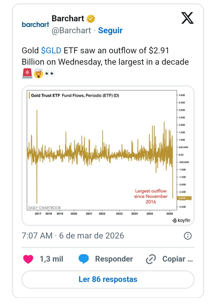 O tal do ETF de ouro, o SPDR Gold Shares, teve uma saída de dinheiro danada na quarta-feira (4): foram mais de 2,9 bilhões de dólares que os investidores tiraram de lá. Esse trem foi o maior esvaziamento em dez anos, conforme os dados da plataforma Barchart.