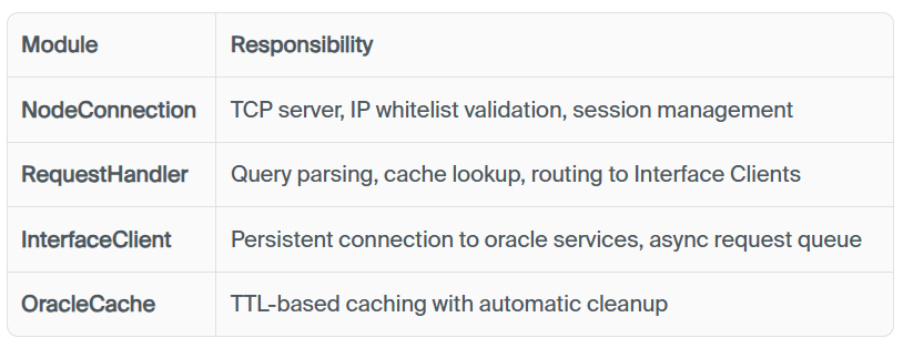 The InterfaceClient maintains persistent connections to oracle services with automatic reconnection on failure, ensuring reliability even when external services experience brief outages.