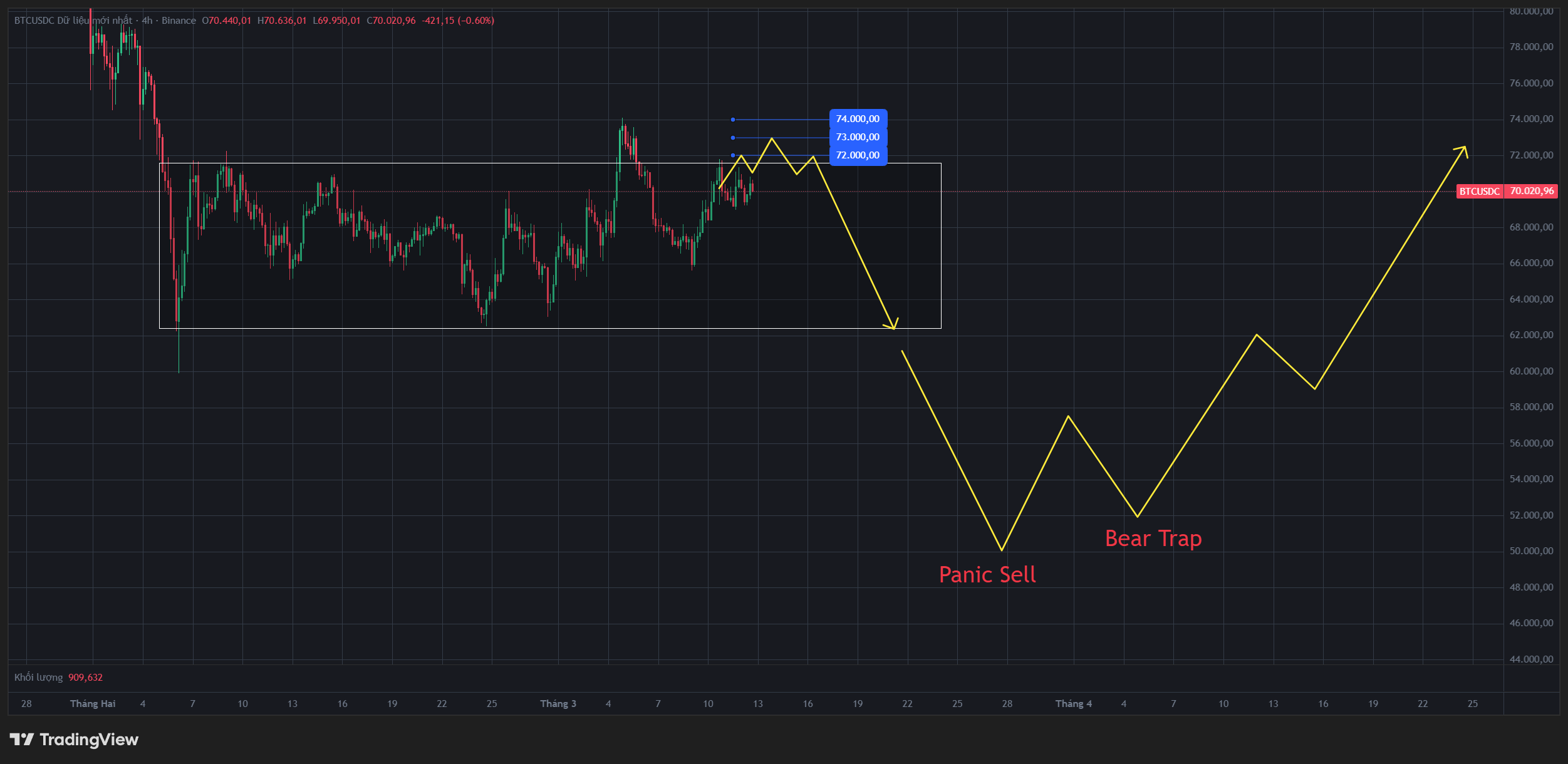 Future khu vực 70.660-70.760 có tường bán hơn 2.500 BTC, hoàn toàn có thể mở vị thế Short Scalping theo tường bán này với SL ở 70.810. Riêng về vị thế Short giữ xuống biên dưới 62.000 thì cần thêm xác nhận (break xuống 69.000) hoặc kiểm định thất bại tại khu vực đỉnh 74.000. Tuy nhiên, nếu view của các bạn là giảm thì có thể vào Short ngay lúc này, SL nên đặt ở 75.100 cho kèo BTC xuống 62.000.