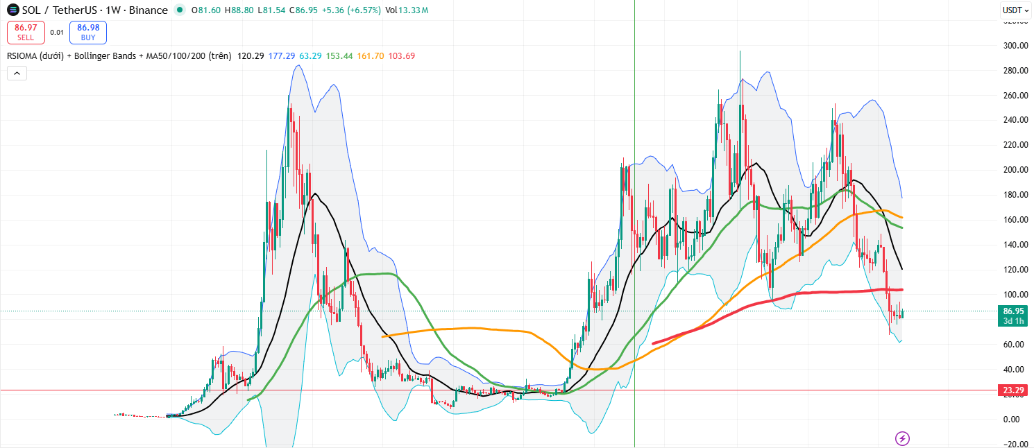 hiện tạiNhìn trên khung tuần, SOL đang trong giai đoạn điều chỉnh sau khi đạt đỉnh. Giá hiện tại khoảng 86.95 USD, đã giảm xuống dưới MA50 (xanh lá) và MA100 (cam), nhưng vẫn giữ được trên MA200 (đỏ) – đường hỗ trợ dài hạn quan trọng. Bollinger Bands đang mở rộng, cho thấy volatility cao, và RSIOMA ở pane dưới cũng đang cho tín hiệu pullback nhẹ. Tổng thể, xu hướng dài hạn vẫn giữ được đà tăng, chỉ là đang “thở” sau một đợt pump mạnh.