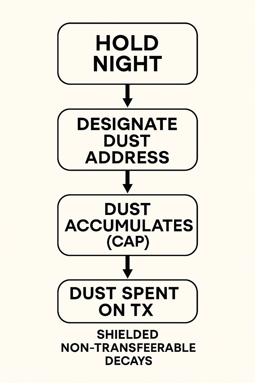 To generate DUST, you must designate a DUST recipient address on the Midnight network — then your DUST balance rises over time until it hits a cap tied to your $NIGHT balance. When you use DUST, it gets burned; NIGHT remains.