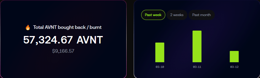 值得注意的是,这一机制已经启动,并计划在第二阶段将销毁比例提升至50%的交易手续费。AVNT的最大供应量为10亿枚,而当前流通量约为3.19亿枚。根据官方数据显示,目前已销毁的代币总数达到57,324枚,价值约9,167美元。其中销毁最多的一天是3月11日,当天销毁了28,981枚,占总销毁量的一半。