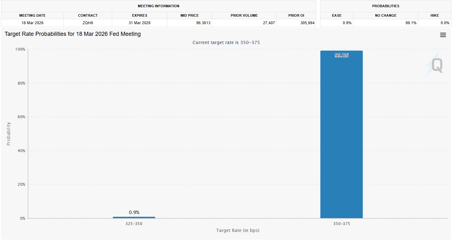 CME FedWatch Tool оценивает вероятность сохранения ставки ФРС на уровне 3,50–3,75% на следующей неделе выше 99%. Такой сценарий уже заложен в цене.