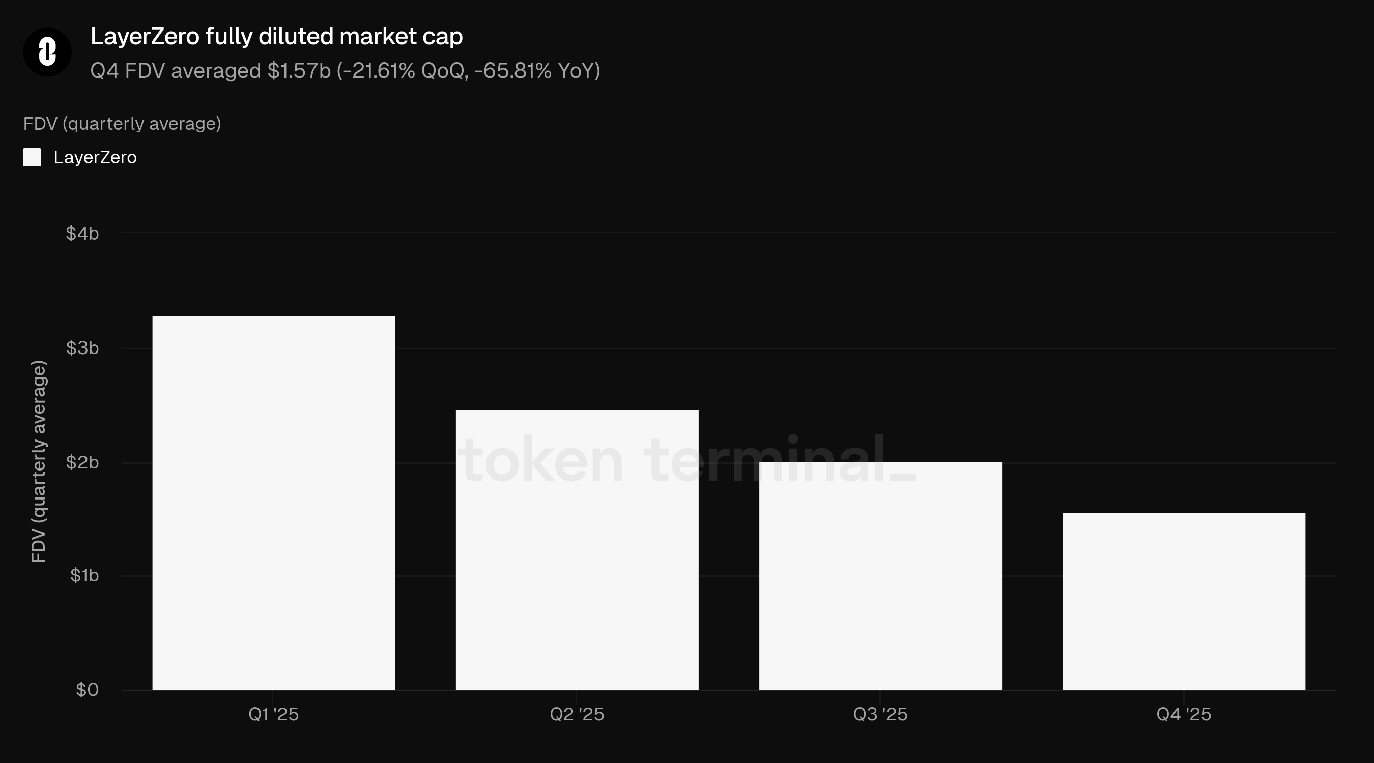 Fully diluted market cap (FDV) measures the total USD value of all ZRO tokens at the current market price, including tokens not yet in circulation. Q4 FDV averaged $1.57b, down from $2.00b in Q3 (-21.61% QoQ) and $4.59b in Q4 2024 (-65.81% YoY). FDV has declined in each of the past five quarters from its peak of $4.59b in Q4 2024, coinciding with a broader market contraction.