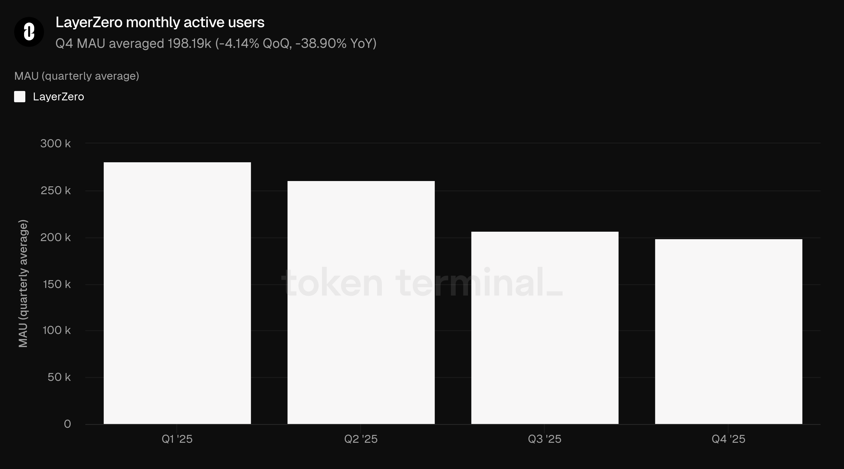 Monthly active users (MAU) measures the number of unique wallet addresses that have interacted with LayerZero over a rolling 30-day period. Q4 MAU averaged 198.19k, down from 206.76k in Q3 (-4.14% QoQ) and 324.39k in Q4 2024 (-38.90% YoY). MAU has declined in every quarter over the past year from a peak of 324.39k in Q4 2024, though the rate of decline slowed in Q4 2025.
