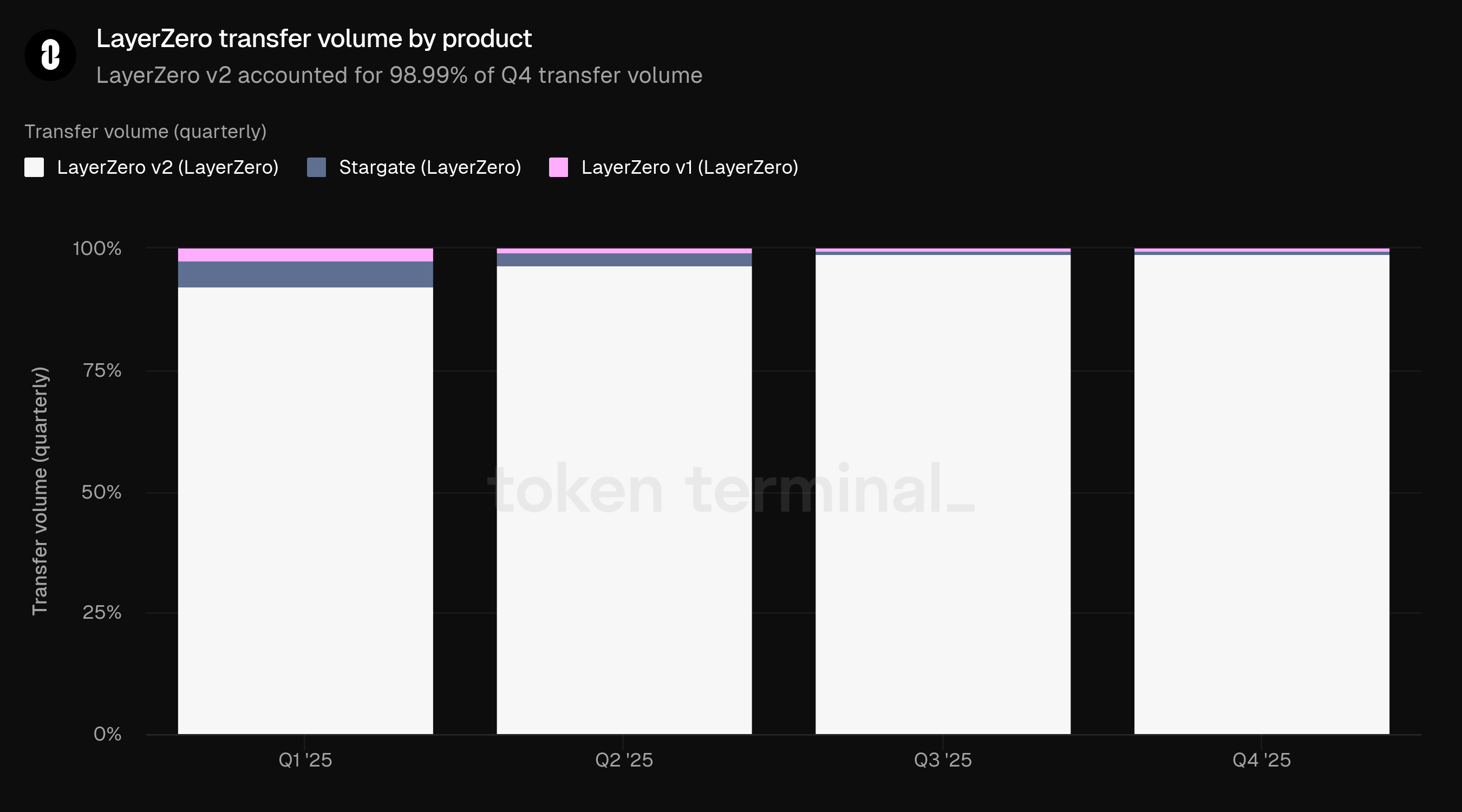 LayerZero v2 accounted for 98.99% of Q4 transfer volume, followed by Stargate at 0.80% and v1 at 0.21%. The product distribution was largely stable quarter-over-quarter, with v2's share rising marginally from 98.90% in Q3. v1 continued its structural decline, falling from 0.28% to 0.21%.