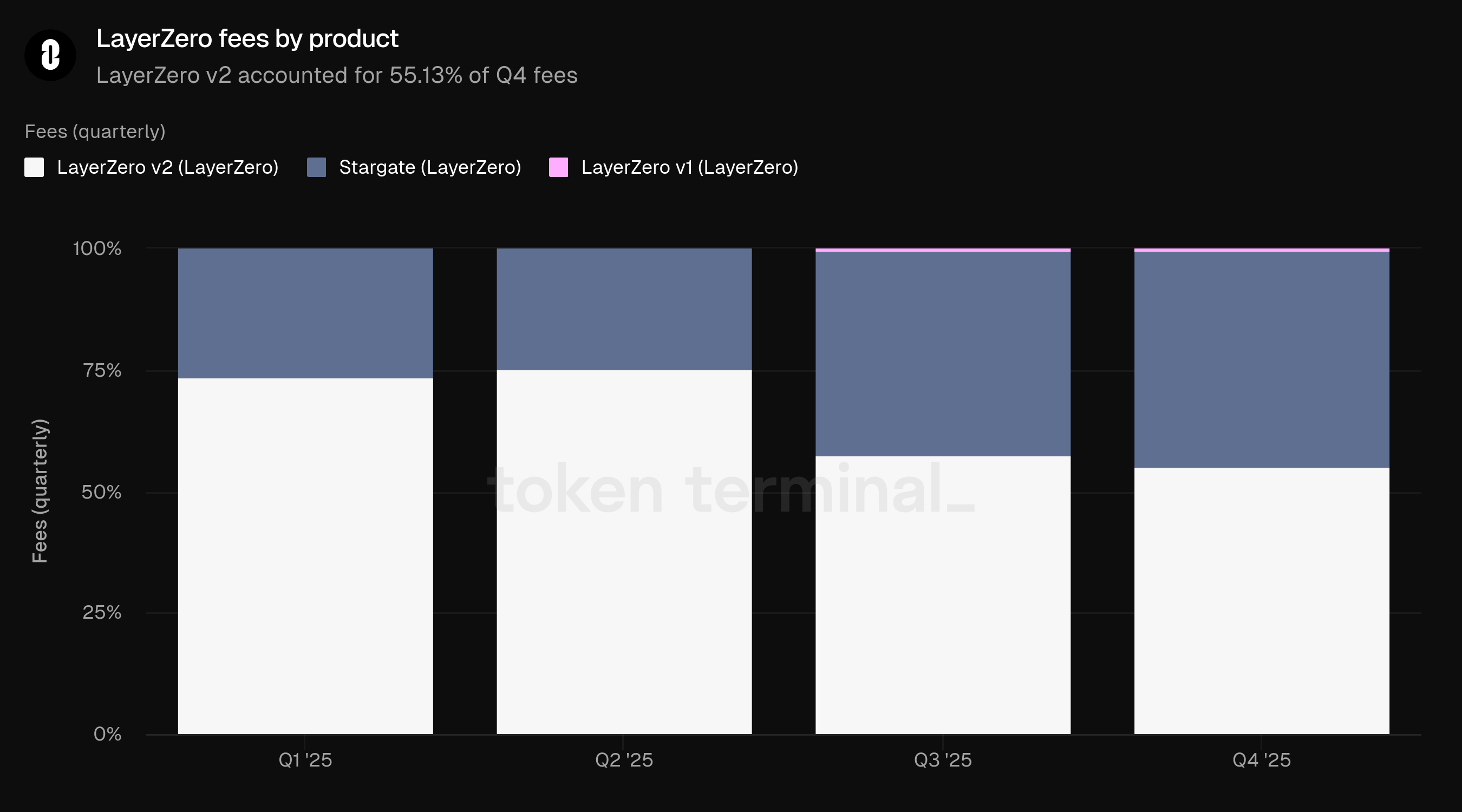 LayerZero v2 generated 55.13% of Q4 fees, followed by Stargate at 44.40% and v1 at 0.47%. Stargate's share grew from 42.08% in Q3 to 44.40%, while v2's share declined from 57.69% to 55.13%. Notably, Stargate contributed 44.40% of fees despite accounting for only 0.80% of transfer volume, reflecting a significantly higher fee rate per dollar transferred compared to v2 messaging.