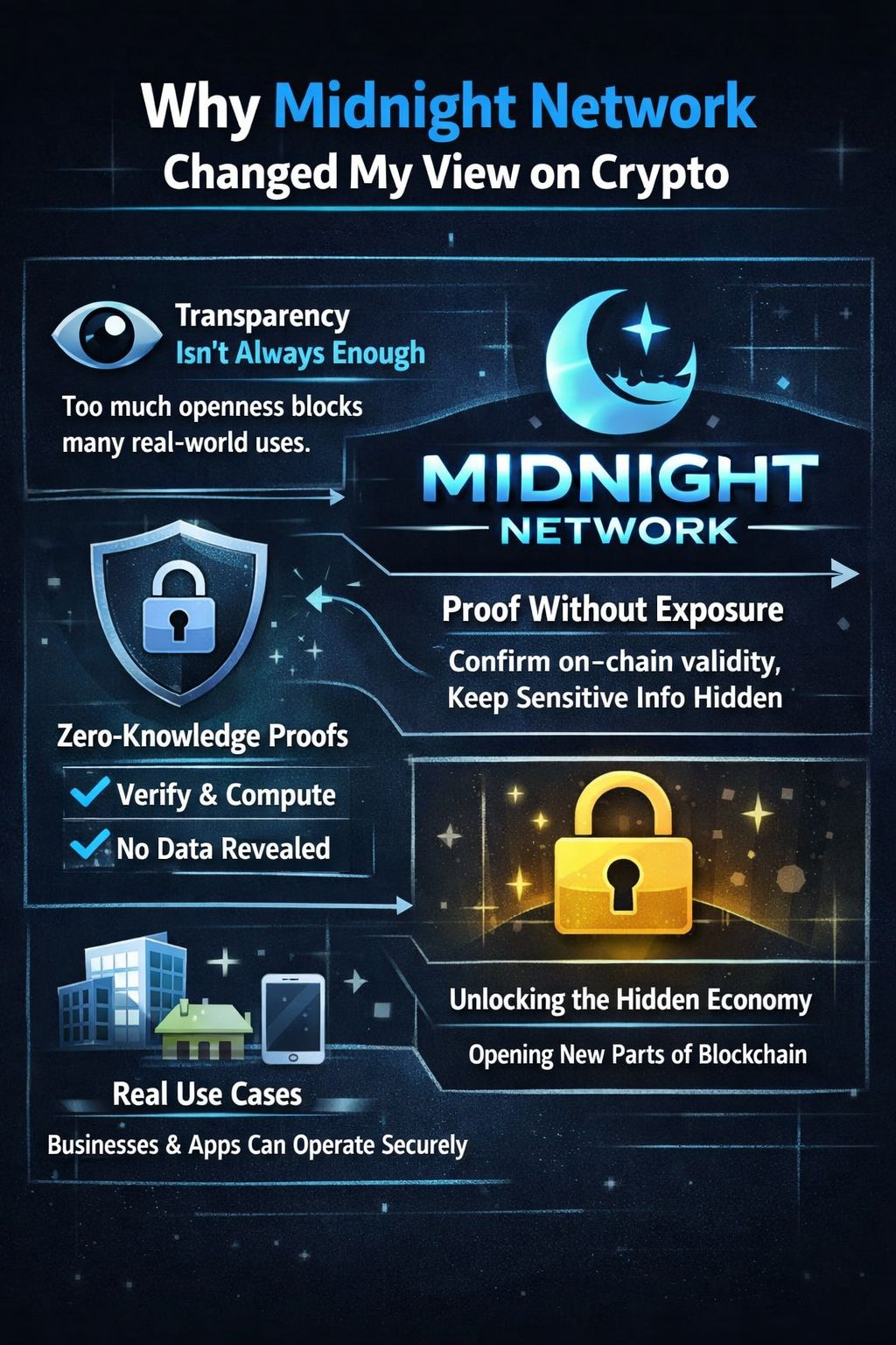 When I first got into crypto, everyone kept talking about transparency like it was the ultimate advantage. But the more I saw, the more I realized that too much openness actually blocks a lot of real-world use cases. That’s when Midnight caught my eye. What really stood out to me was how it uses zero-knowledge proofs—letting you verify and compute things without ever exposing the underlying data. In simple terms, you can prove something is valid on-chain without revealing the sensitive details, and that really felt like a game-changer.