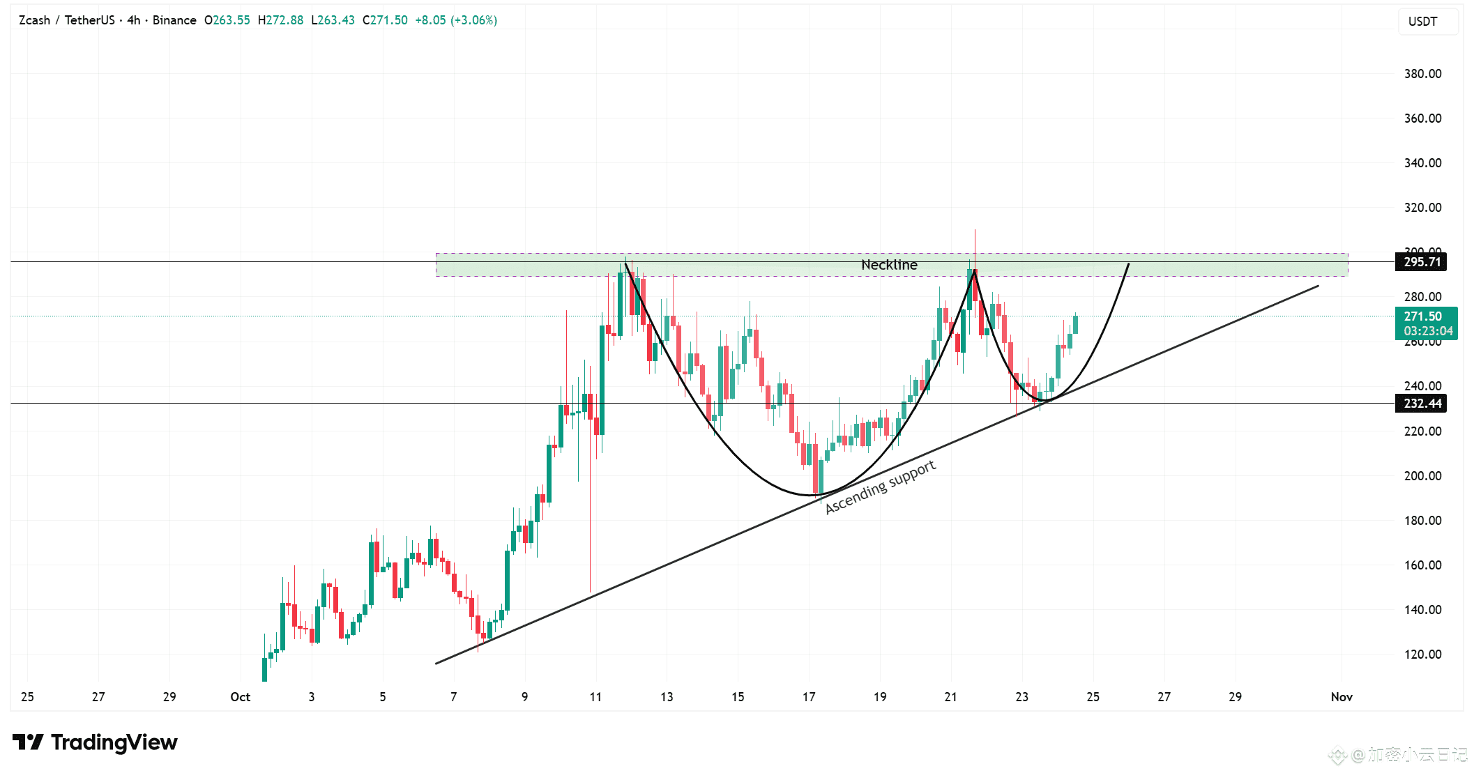 成交量持续放大,低点不断抬高,显示买方力量逐渐主导走势。只要守住 232 美元支撑,ZEC 的上升结构仍具延续性。
