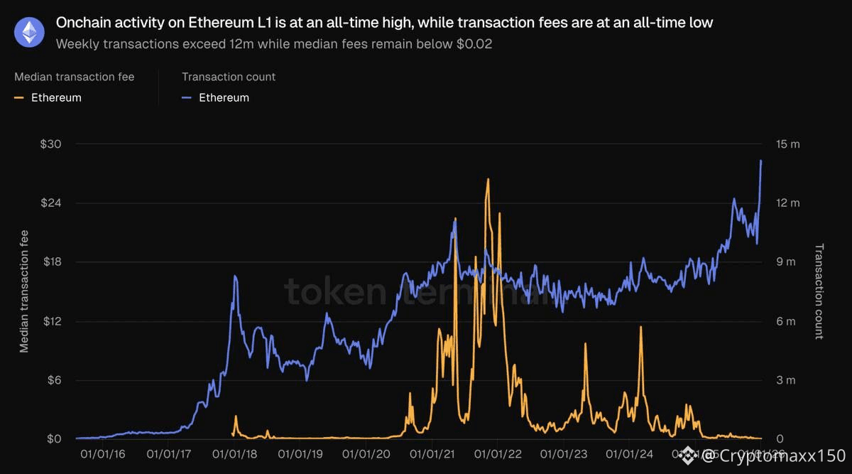 البيانات الأخيرة تُظهر أن عدد المعاملات الأسبوعية تجاوز 12 مليون معاملة، وهو أعلى مستوى تاريخي في وقت انخفضت فيه الرسوم المتوسطة إلى أقل من 0.02$.