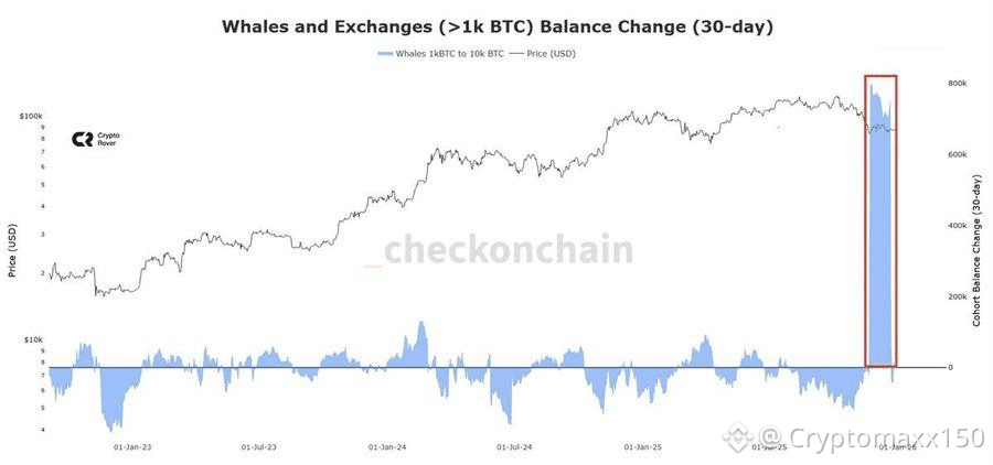 بيانات تغيّر أرصدة الحيتان (>1k BTC) خلال آخر 30 يومًا تُظهر قفزة واضحة في الرصيد، ما يعكس نشاط تجميع فعلي عند المستويات الحالية.