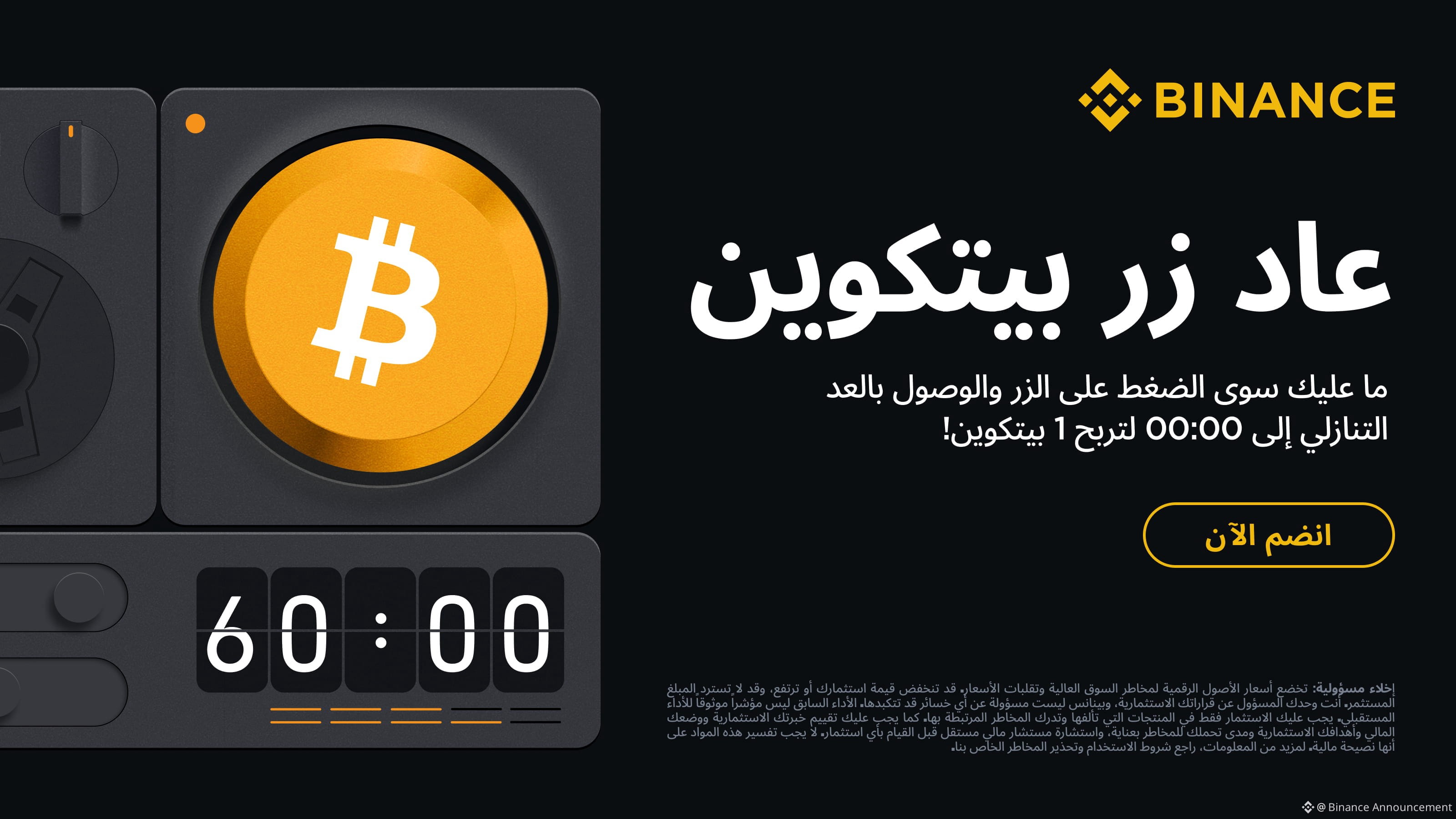 قررنا إعادة إطلاق لعبة زر بيتكوين للمجتمع. انضم إلى لعبة زر Binance واربح 1 BTC إذا تمكنت من أن تكون أول من يصل بالعد التنازلي إلى 00:00!