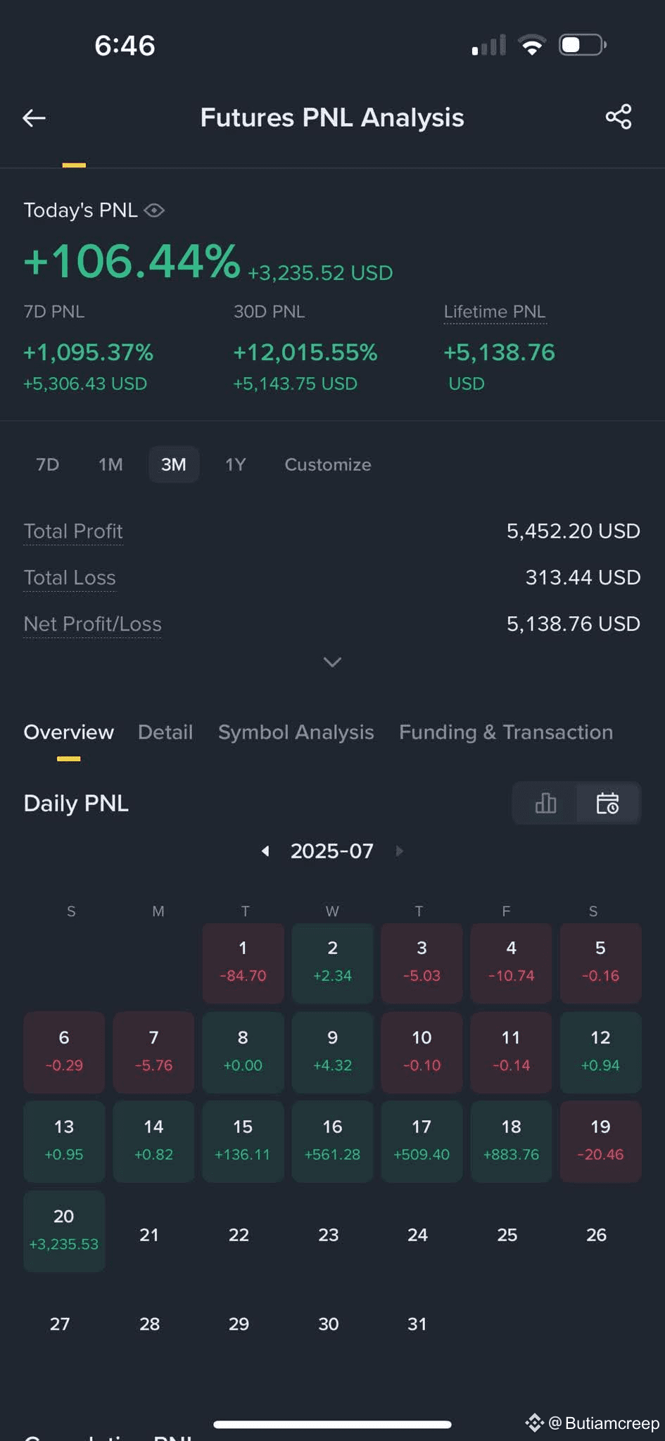 Looking at the daily PNL calendar, the first week of July was filled with red — signs of tough days. But starting July 13, green took over. Major profit days came on: