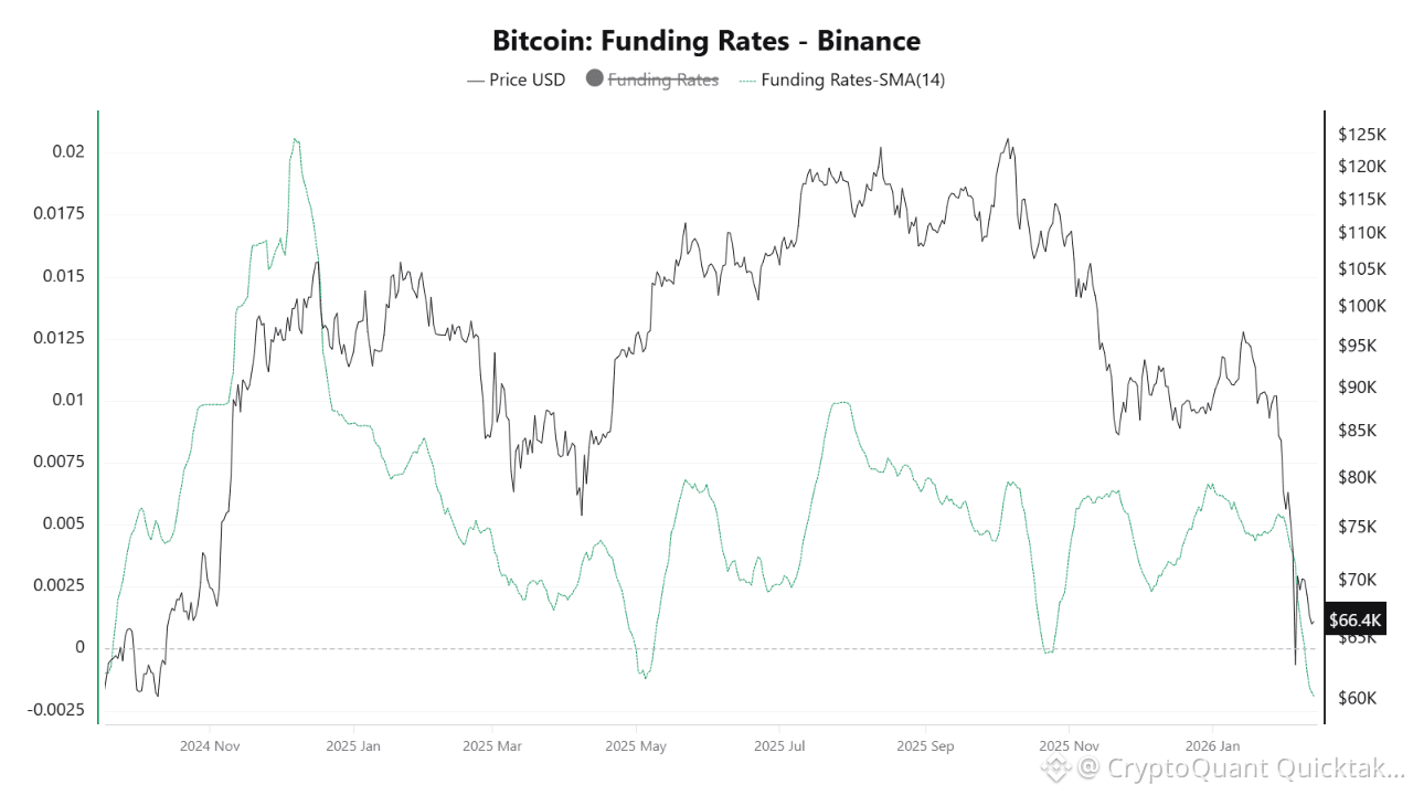 Recent data from Binance indicates that the 14-day Simple Moving Average (SMA-14) of Bitcoin Funding Rates has dropped to a critical level of −0.002. This marks the lowest value this metric has recorded since September 2024 (surpassing even the lows observed in May 2025). Concurrently, Bitcoin’s price has been in a grinding downtrend, currently trading around the $66.4K range.