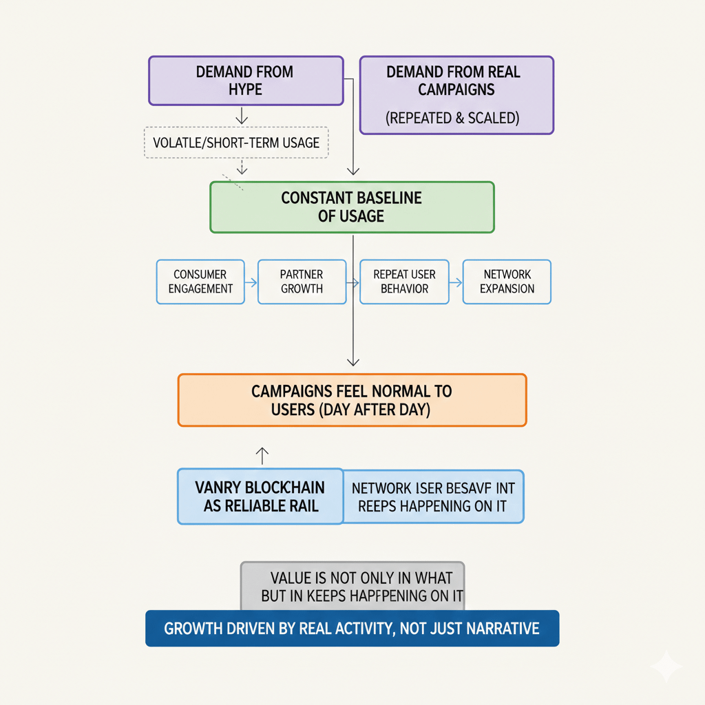 This is where the link to VANRY becomes clear in a grounded way, because demand that comes from repeated real campaigns looks different from demand that comes from hype, and if brands and eco programs run at scale they create a constant baseline of usage, partner growth, and repeat user behavior that does not need a new narrative every week, and when a chain becomes the reliable rail for these consumer loops, the value is not only in what people say about it, but in what keeps happening on it day after day through campaigns that feel normal to users while quietly expanding the network’s real footprint.
