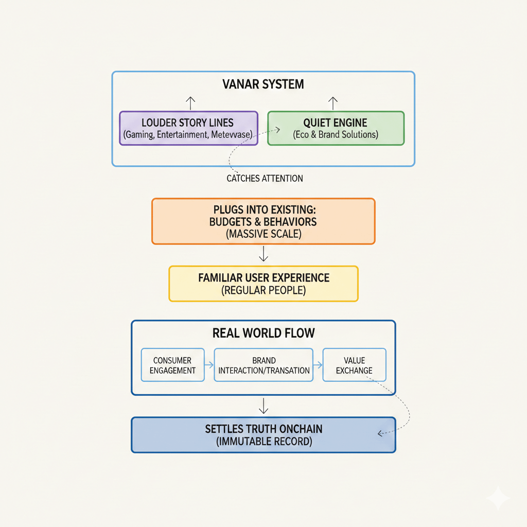 Vanar through the louder story lines, the ones that naturally catch attention because they sit close to gaming, entertainment, and metaverse style experiences, yet when I look at what can actually scale into daily life without asking users to become crypto natives, the eco and brand solutions angle feels like the real quiet engine because it plugs into budgets and behaviors that already exist at massive scale and it does so in a way that feels familiar to regular people while still settling the truth onchain.