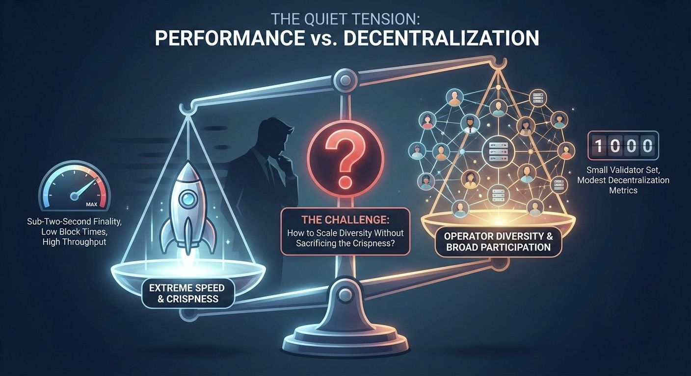 Still, speed always has a shadow. The same snapshot shows a small validator set and modest decentralization metrics. That’s not unusual for a young network, but it’s something I can’t ignore. When you optimize for proximity and performance, you risk tightening the circle of participation. It’s the quiet tension underneath the whole design: how do you scale operator diversity without sacrificing the crispness that makes the system appealing in the first place?