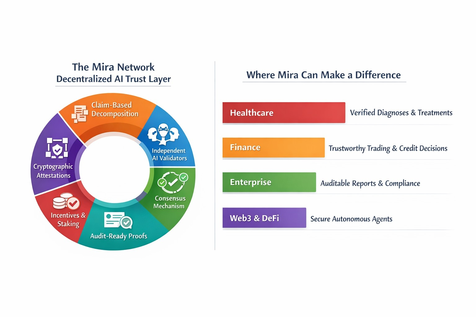 By cracking the verification problem,Mira lets AI step into high stakes roles with real confidence.In healthcare,AI generated diagnoses or recommendations get validated before anyone’s care changes.In finance, trading signals or credit decisions get consensus checked before money moves.In enterprise settings,AI generated reports can be audit ready with cryptographic proof.And in Web3,autonomous agents finally have a foundation for trustworthy action.