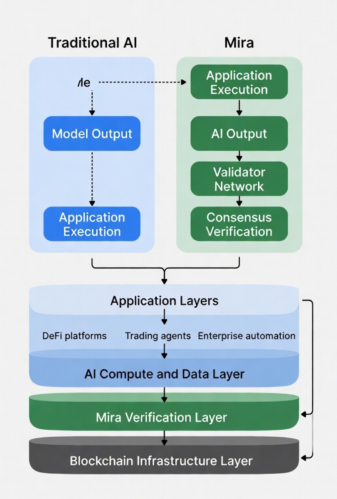 A comparison chart showing two flows. The first path represents Traditional AI where Model Output goes directly to Application Execution. The second path represents Mira architecture where AI Output goes through Validator Network and Consensus Verification before reaching Application Execution.