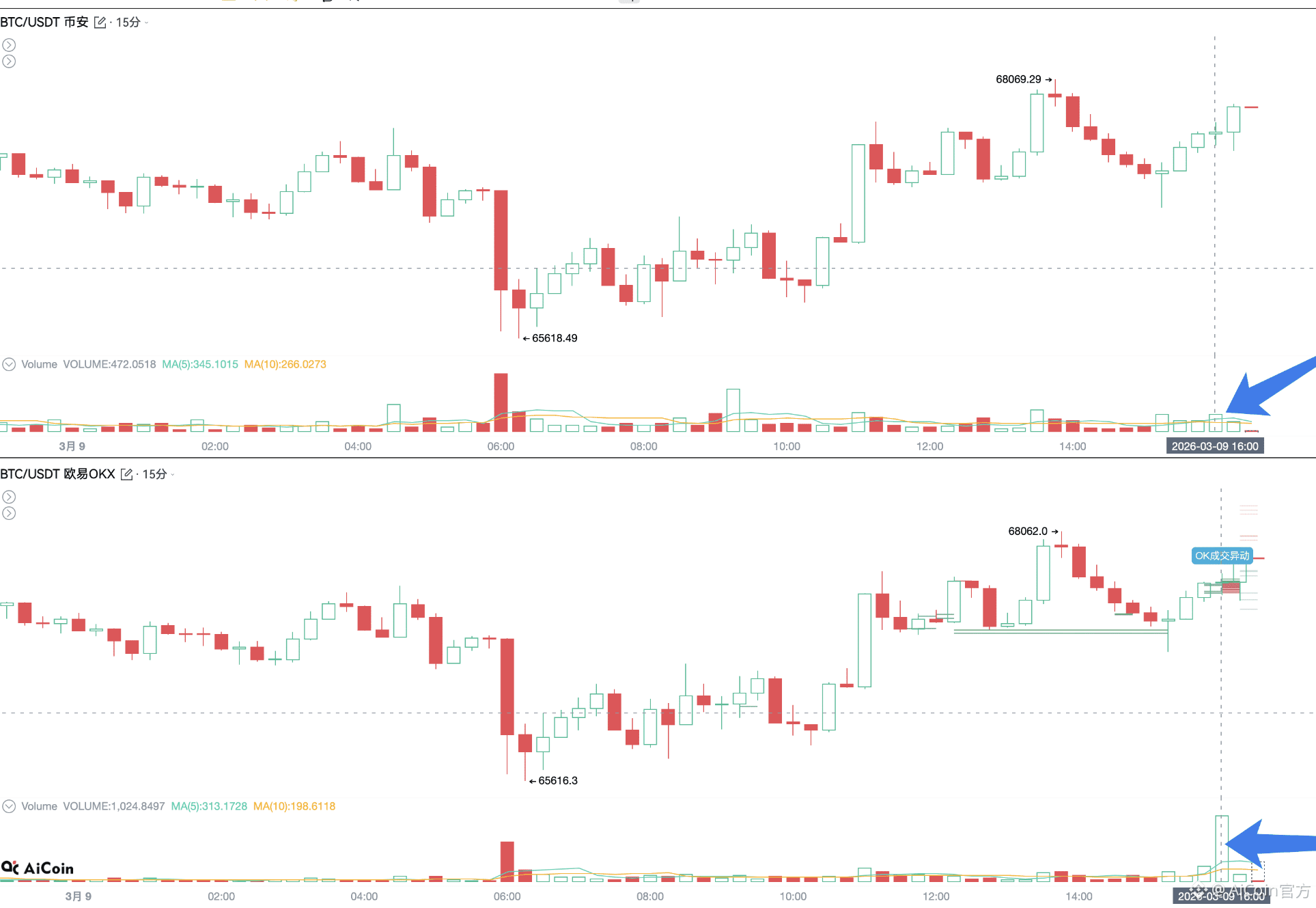 最近一两个月,OKX 的 BTC 成交量,经常在这个时间段突然异动放量,而且币安等其他平台成交量完全没跟上。