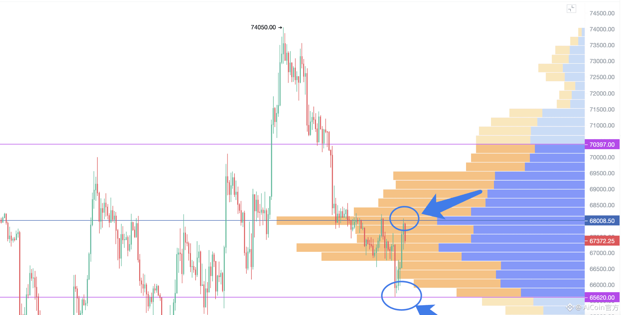 我看的是币安 BTC/USDT 现货近一个月的筹码峰,做短期合约的朋友,可以看永续合约 + 更短周期的筹码。\