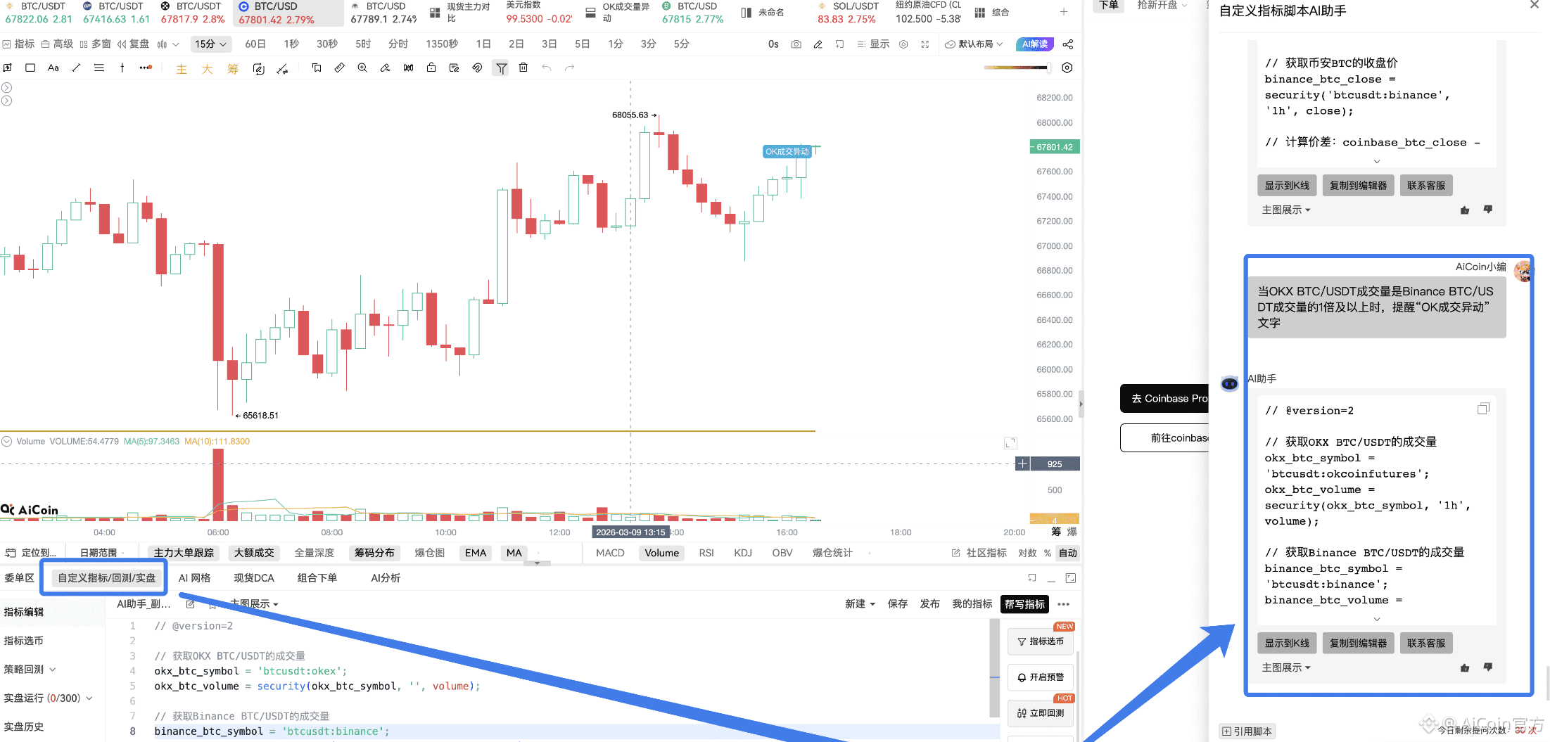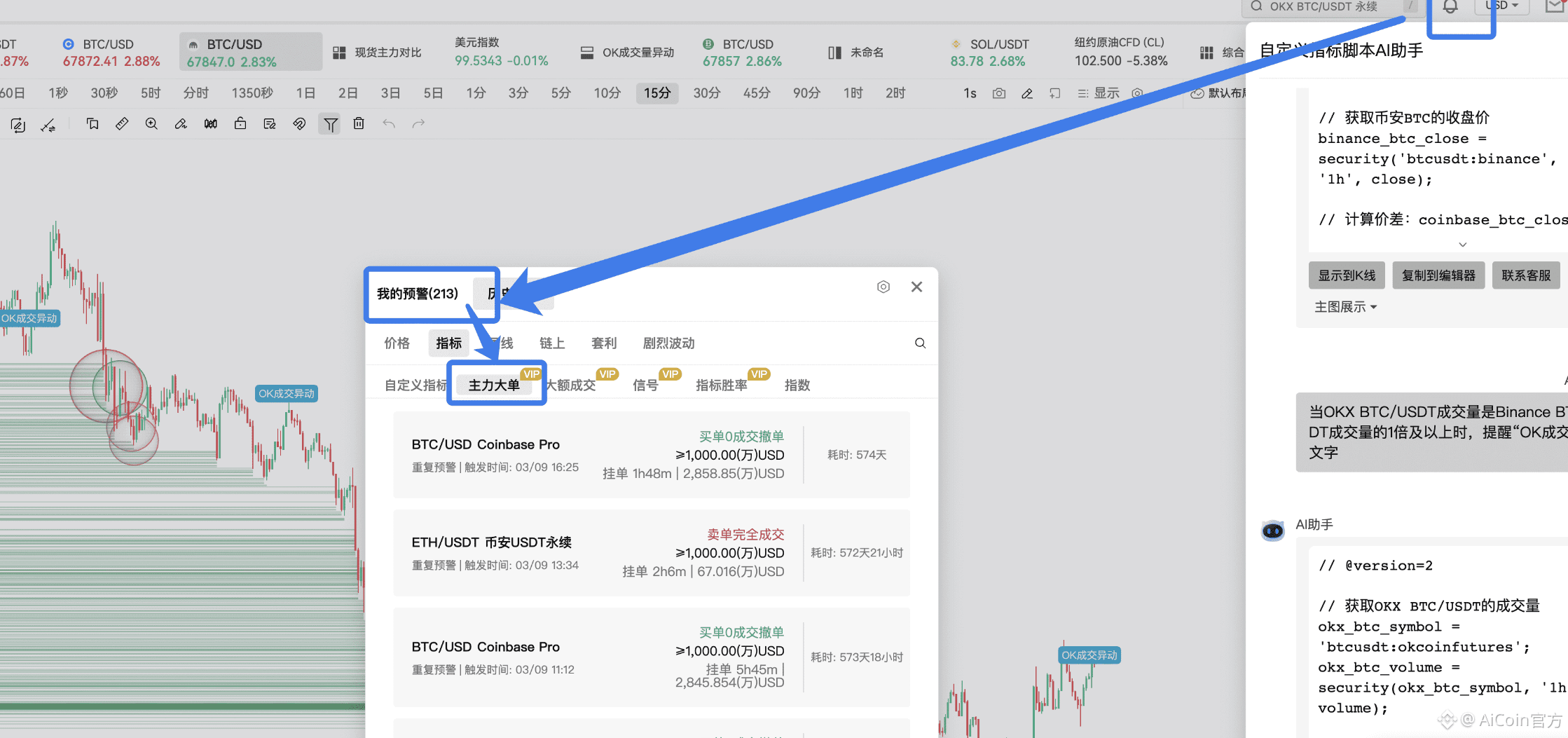 想自己跟踪这个信号的朋友,用自定义指标就能实现,我截图里的 “OK 成交异动” 文字提醒,就是 AI 写指标做的。