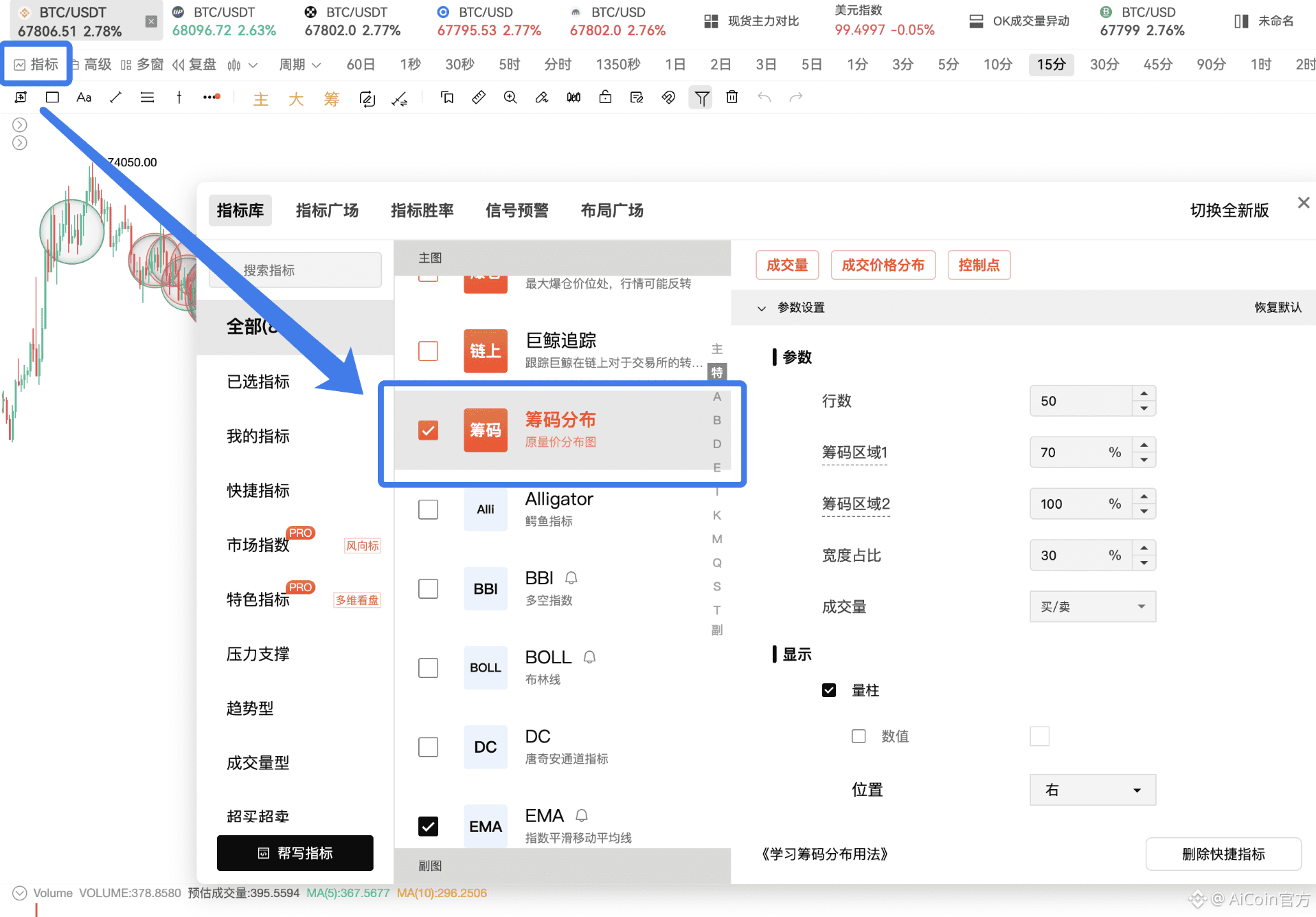 只需要改一下标识码:okx_btc_symbol = 'btcusdt:okex',这是会员专属功能,支持预警、绘图、实盘同步。